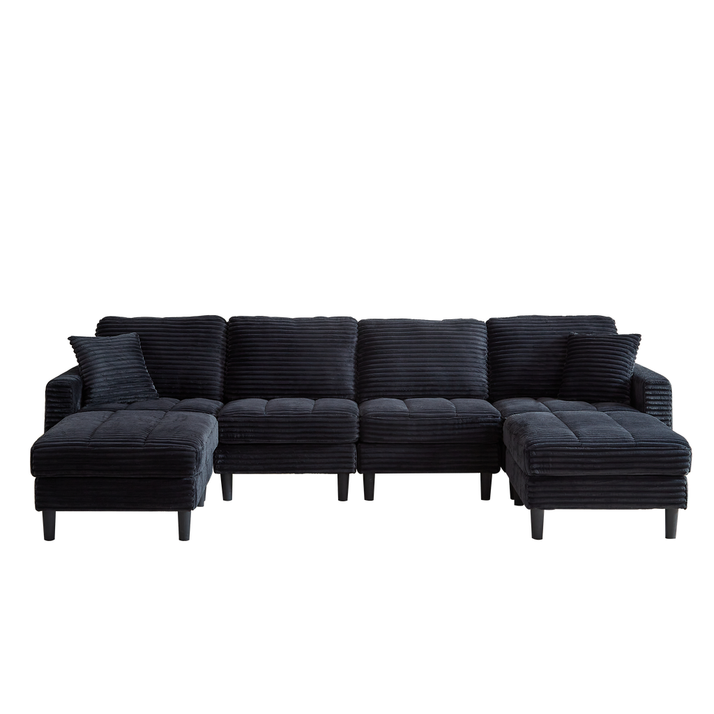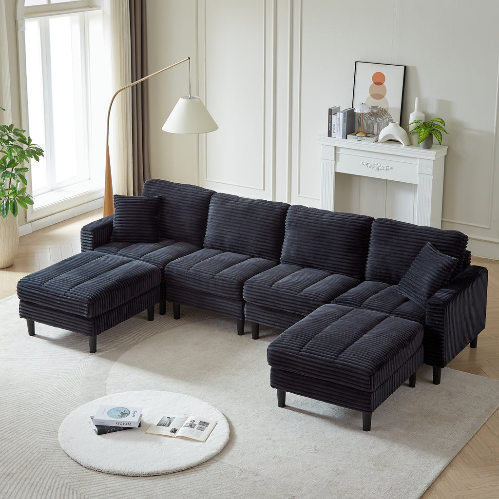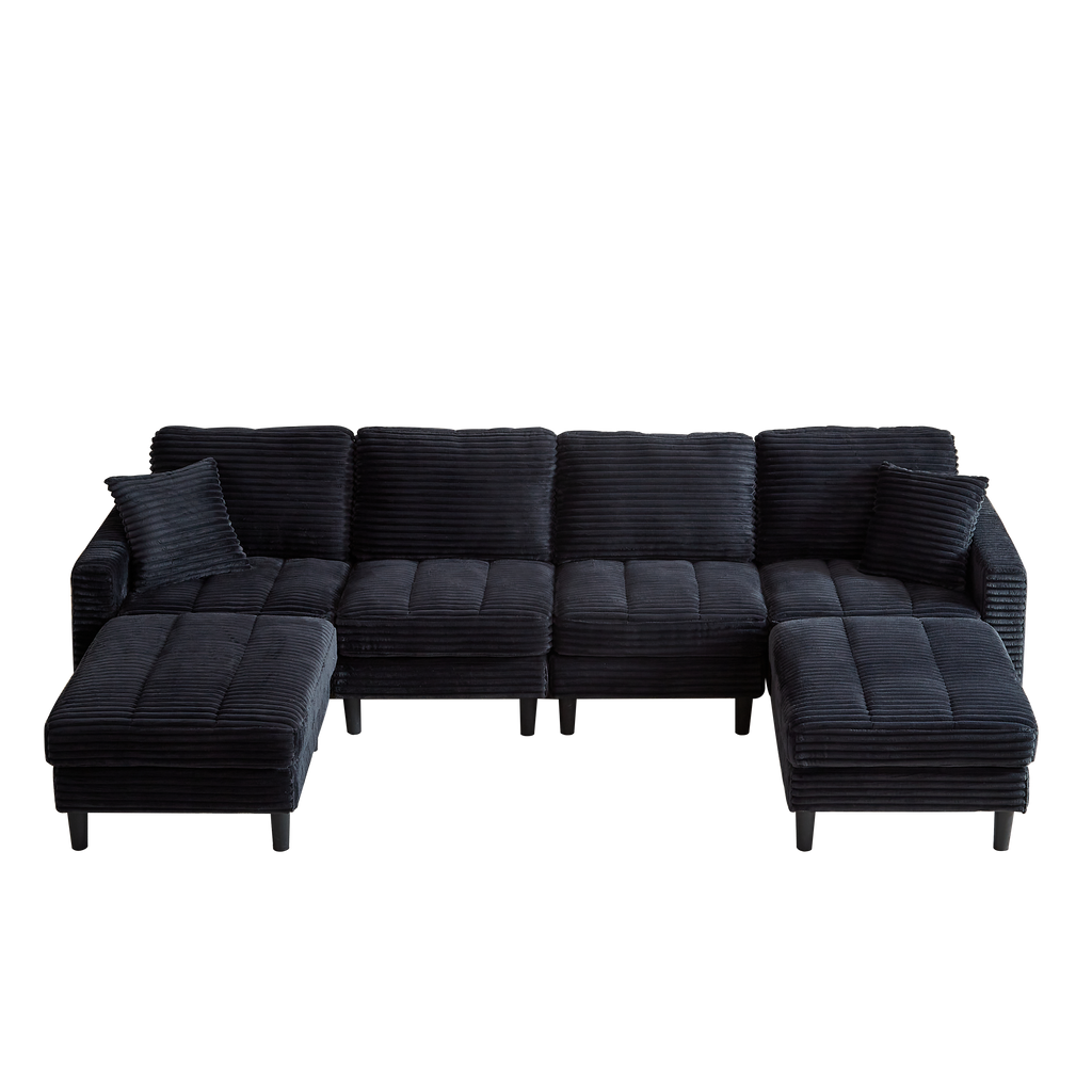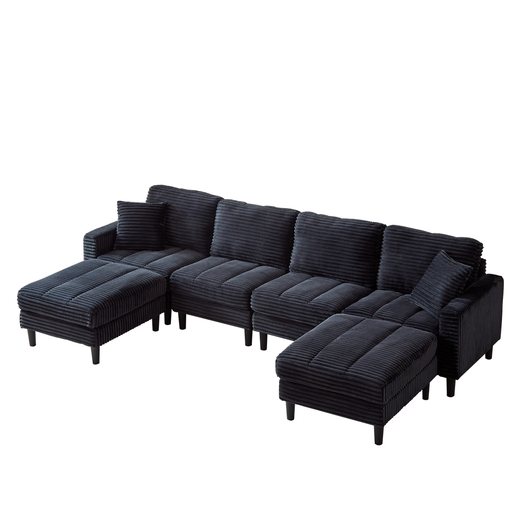 122.5-Inch Oversized U-Shaped Modular Sofa, Corduroy Fabric Sofa, Living Room Sectional Sofa with 2 Pillows, Two ottoman, plastic leg, Black