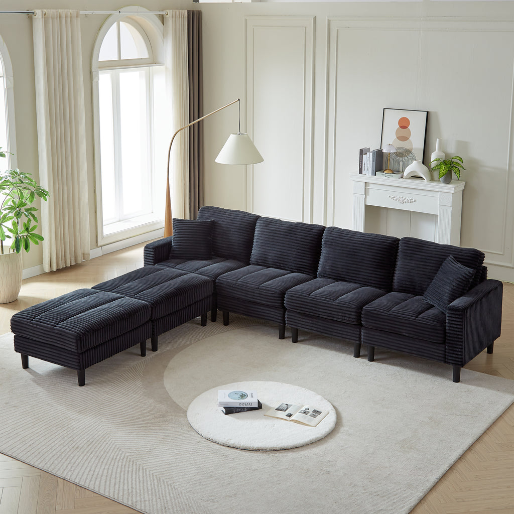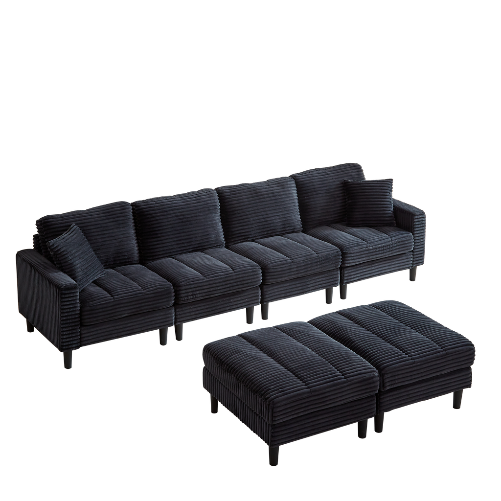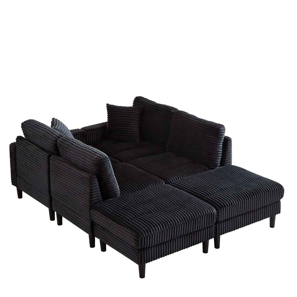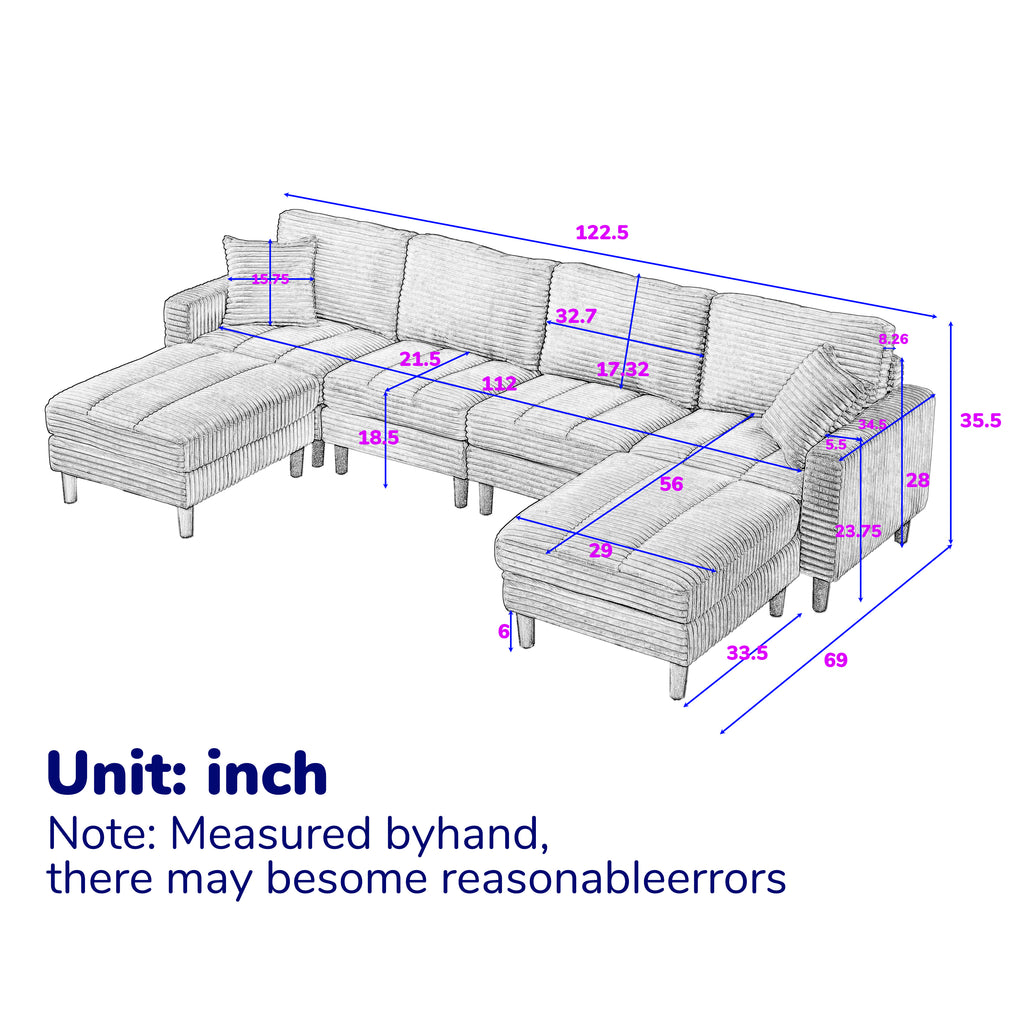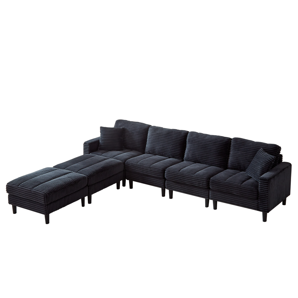 122.5-Inch Oversized U-Shaped Modular Sofa, Corduroy Fabric Sofa, Living Room Sectional Sofa with 2 Pillows, Two ottoman, plastic leg, Black