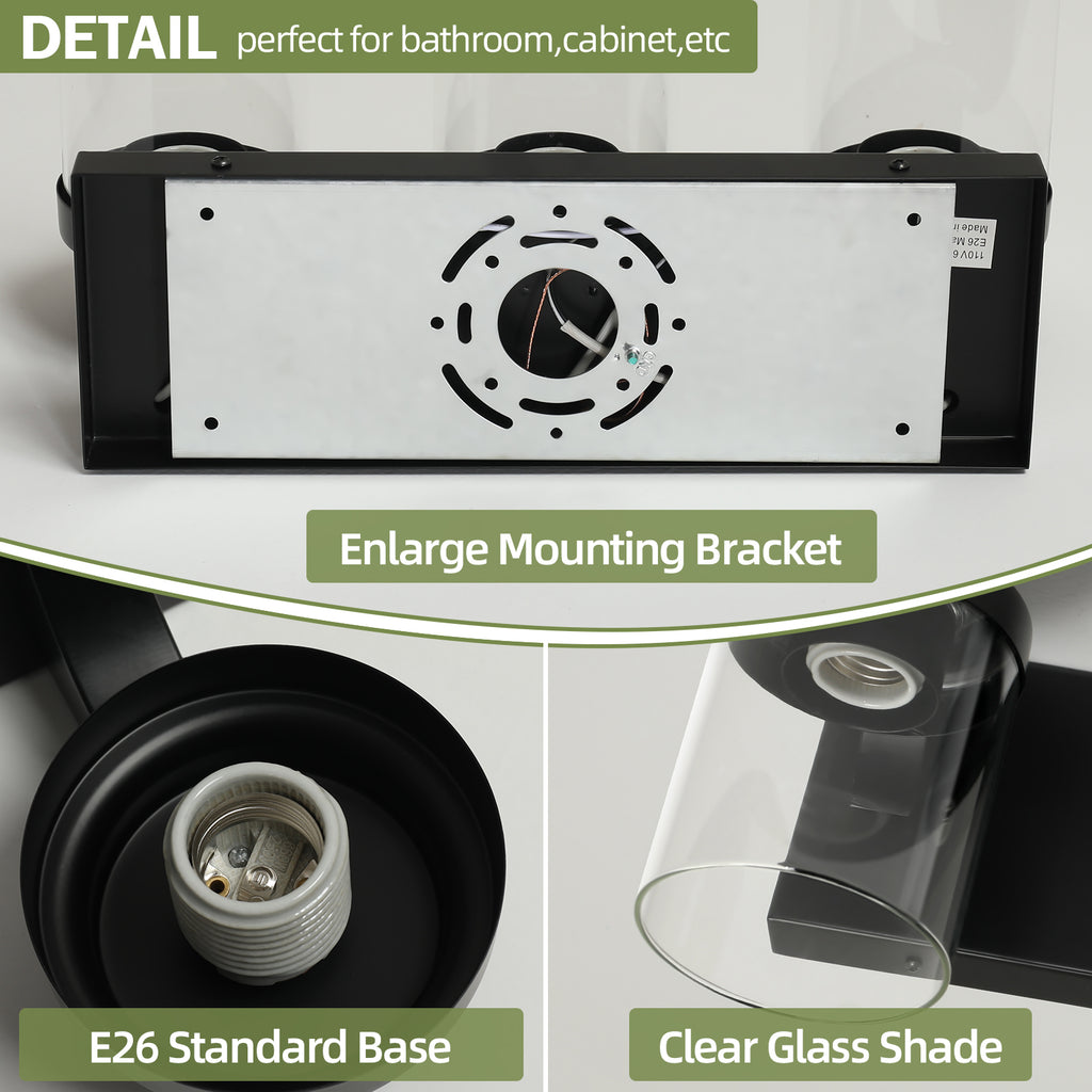 - Sturdy Frame Construction & Extra Large Base Panels: This 3-light black bathroom vanity light is made of matte black finish frame, clear glass lampshade, and ceramic sockets. The metal surface adopts matte craft, no need to worry about oxidation and fading. The extended base can provide better stability for the lamp and can completely cover the size of the junction box, making the use of electricity safer.