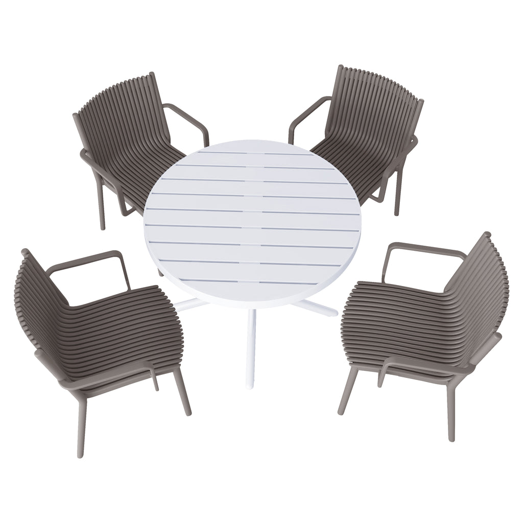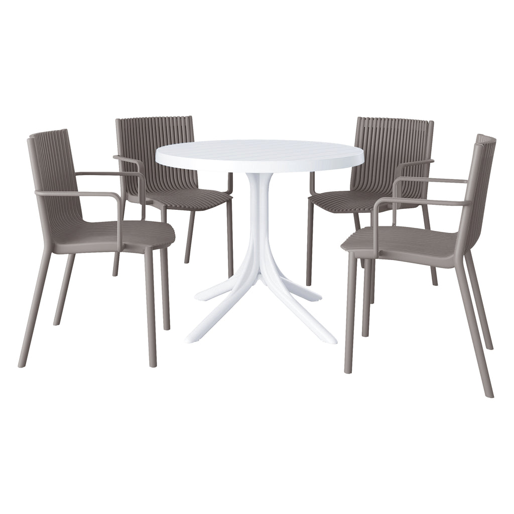 4pcs Warm Grey Stackable PP Armchair for Indoor/Outdoor Use – Ergonomic Slatted Back with 36 Inch Indoor/Outdoor Modern White Round PP Table