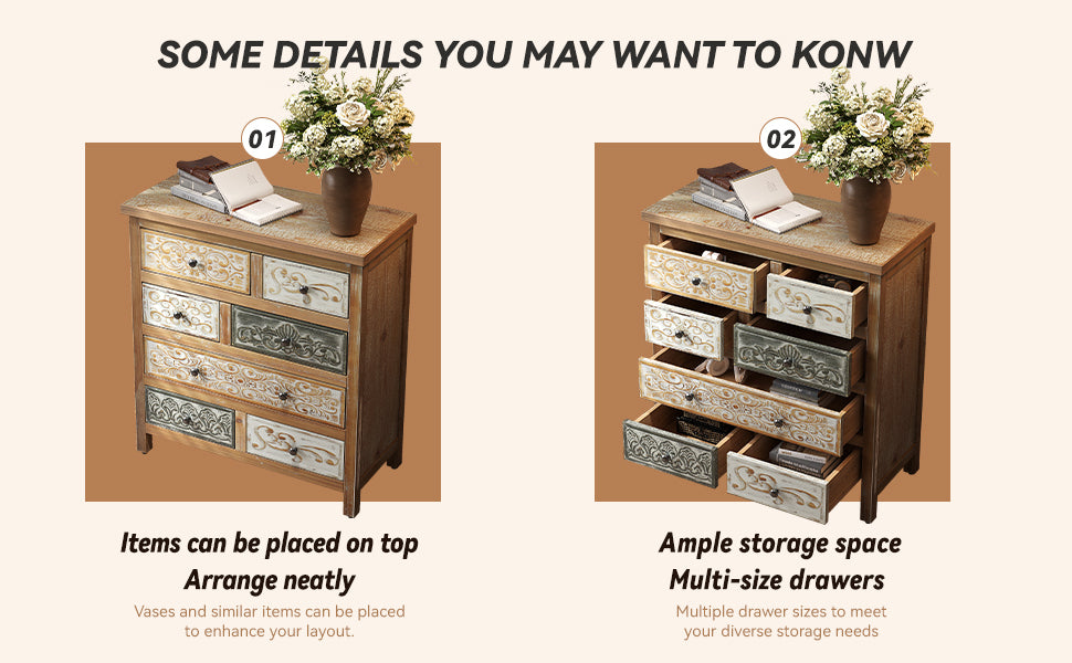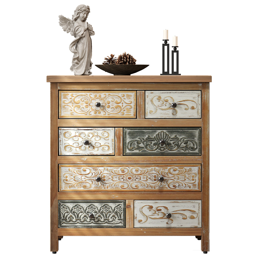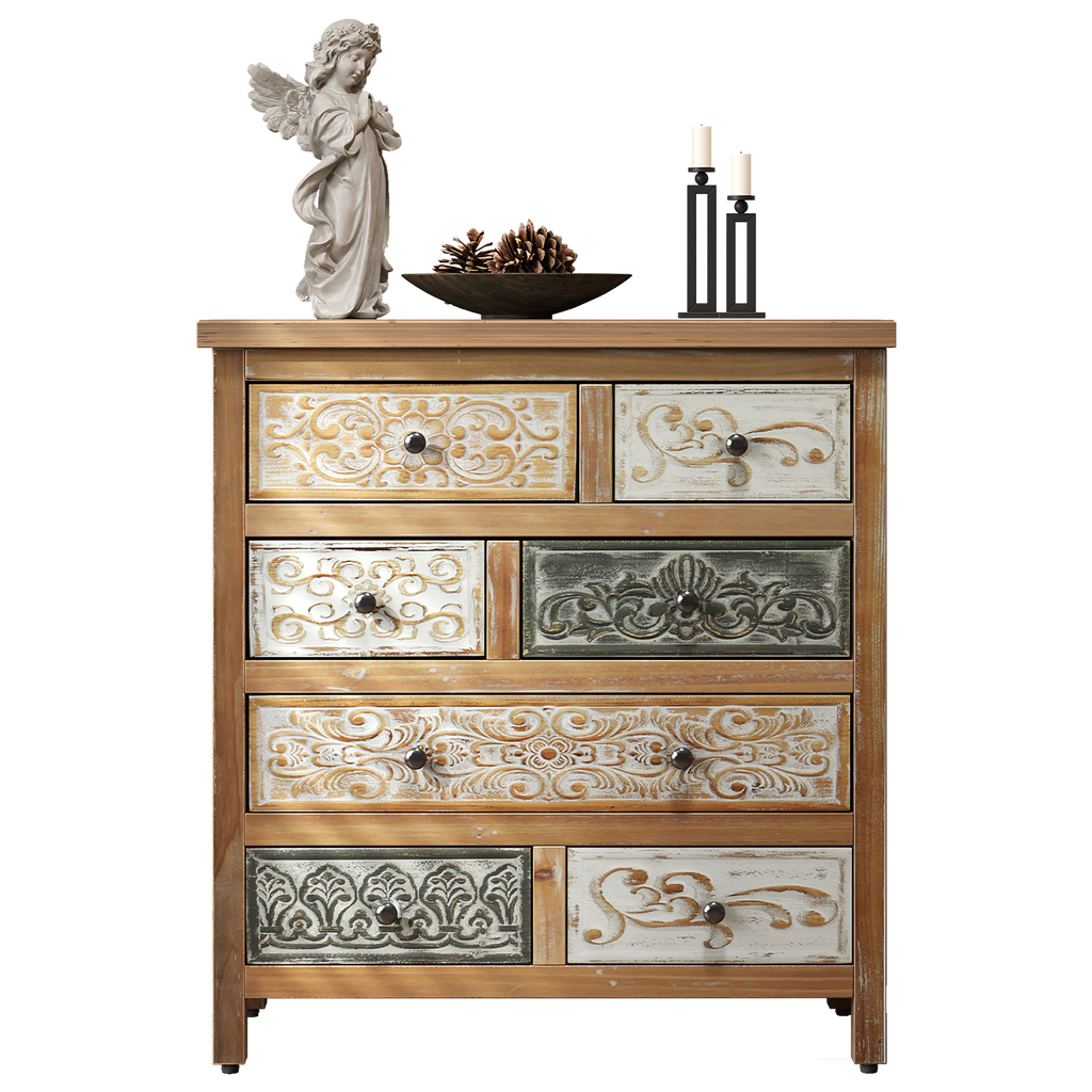 • Charming Vintage Design: Features multicolor carved patterns on each drawer, paired with a distressed wood finish, creating an antique and eclectic aesthetic that adds character to any space.