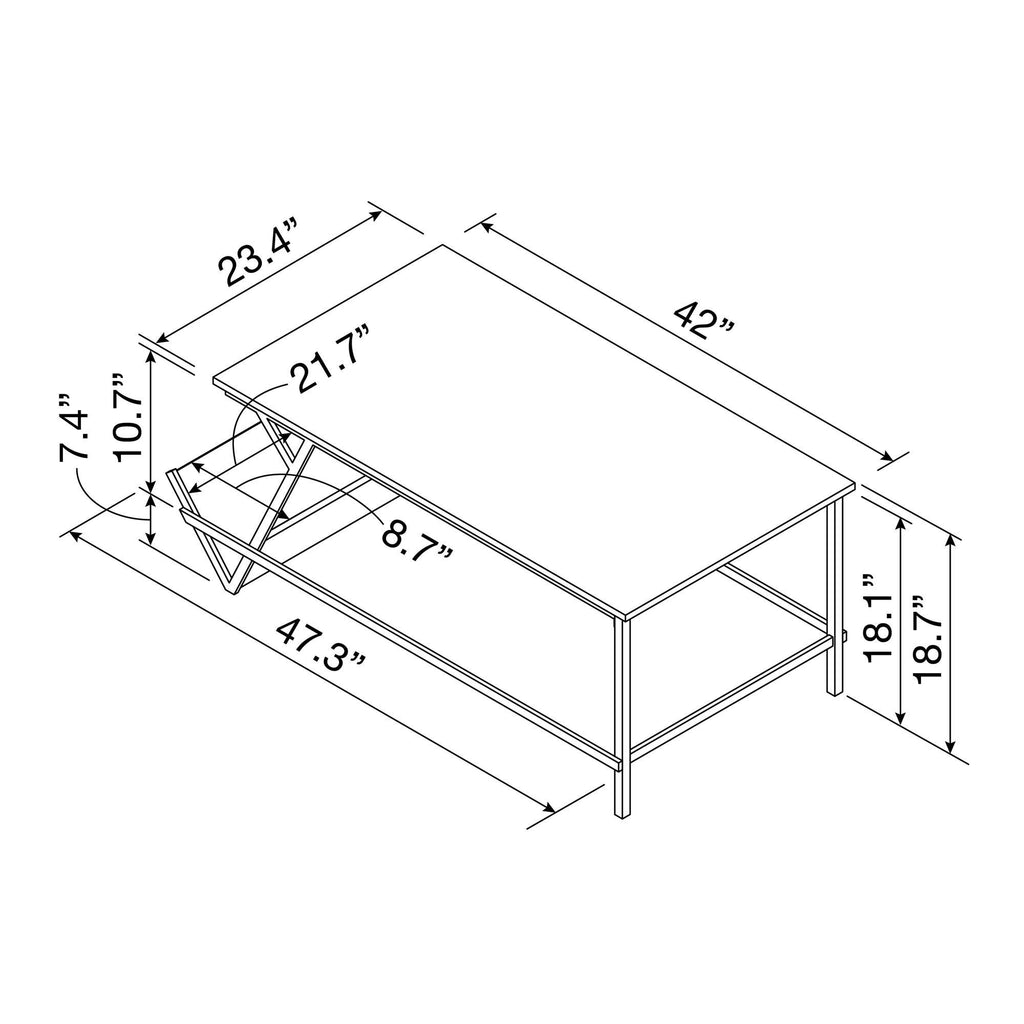 • The Coffee Table ships flat to your door and 2 adults are recommended to assemble. The table top can hold up to 60 lbs. while the side shelf can hold 20 lbs. Assembled dimensions: 18.65'H x 42'W x 23.35'D