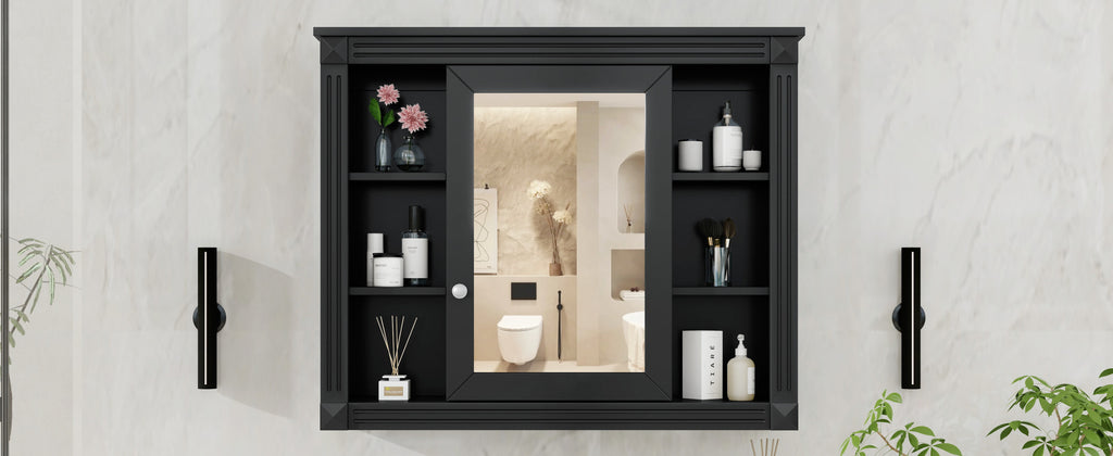 This wall-mounted mirror cabinet perfectly combines modern design with excellent functionality. It is made of high-quality MDF board, which is durable and environmentally friendly. The high-definition mirror provides clear reflections, making every use convenient and quick. The clever design combines hidden and open shelves to store personal items and keep the space tidy, while displaying commonly used items for easy access. Two built-in storage cabinets meet large-capacity storage needs and perfectly hide clutter. The three-layer adjustable storage board allows you to flexibly adjust the storage space according to your needs and adapt to the storage of different items. The included towel rod design allows you to easily hang towels or clothes, increasing the practicality and convenience of the bathroom. Whether it is the bathroom, bedroom or other space, this mirror cabinet can provide a neat, practical and beautiful storage solution to improve the quality of your home life.