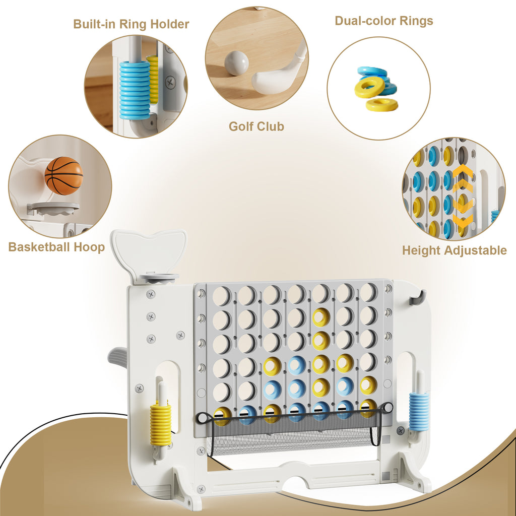 4-to-Score Giant Game Set with Mesh Bag & Jumbo Connect 4, Basketball Hoop, Ring Toss & Golf Games, Height Adjustable in White+Gray HDPE