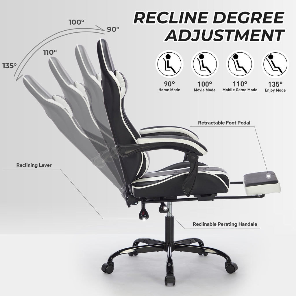 • Adjustable backrest : The adjustable gaming desk chair backrest features a safe angle of 90°-135°chair gaming, allowing you to choose the right seat height and tilt according to your needs and experience ultimate versatility reclining gaming chair.
