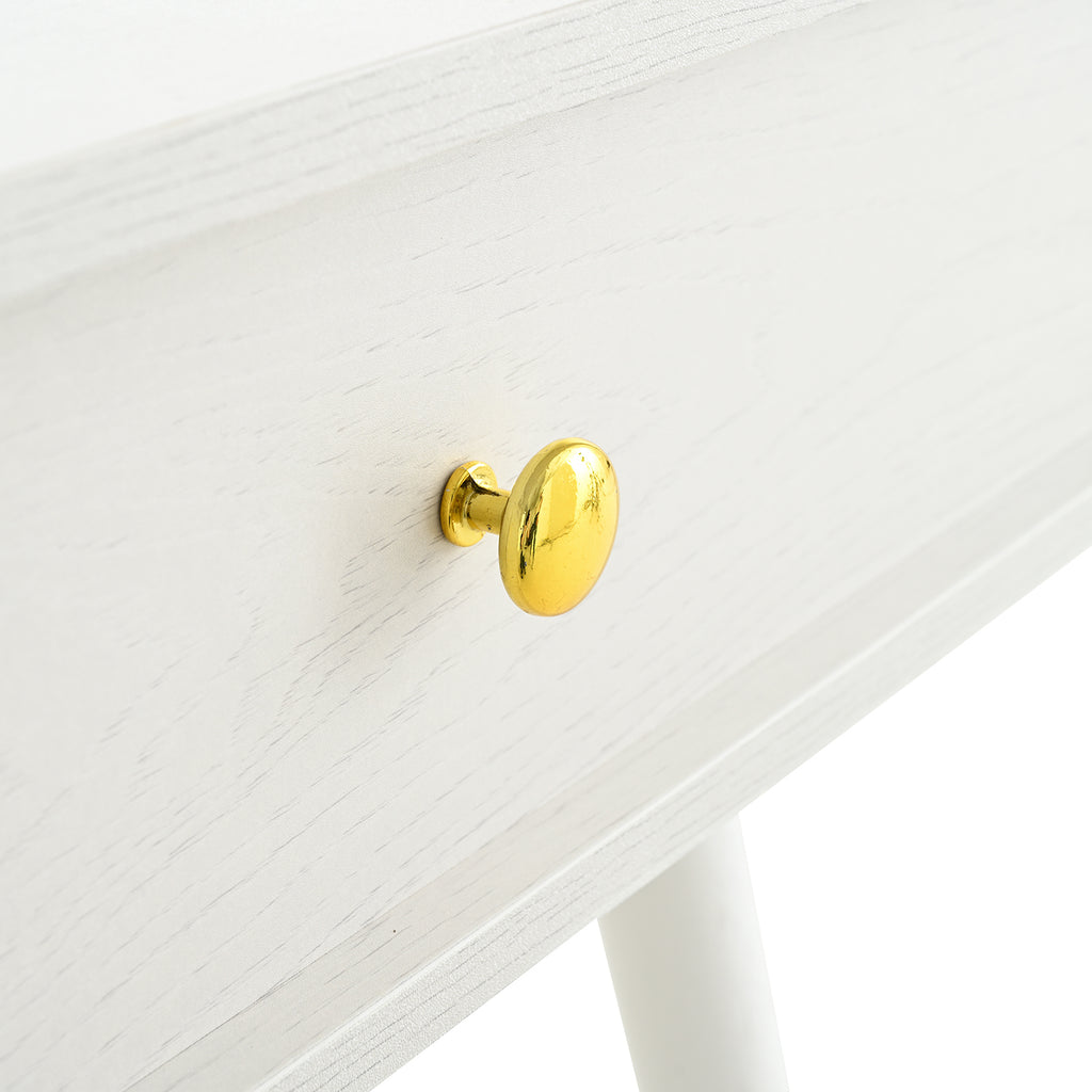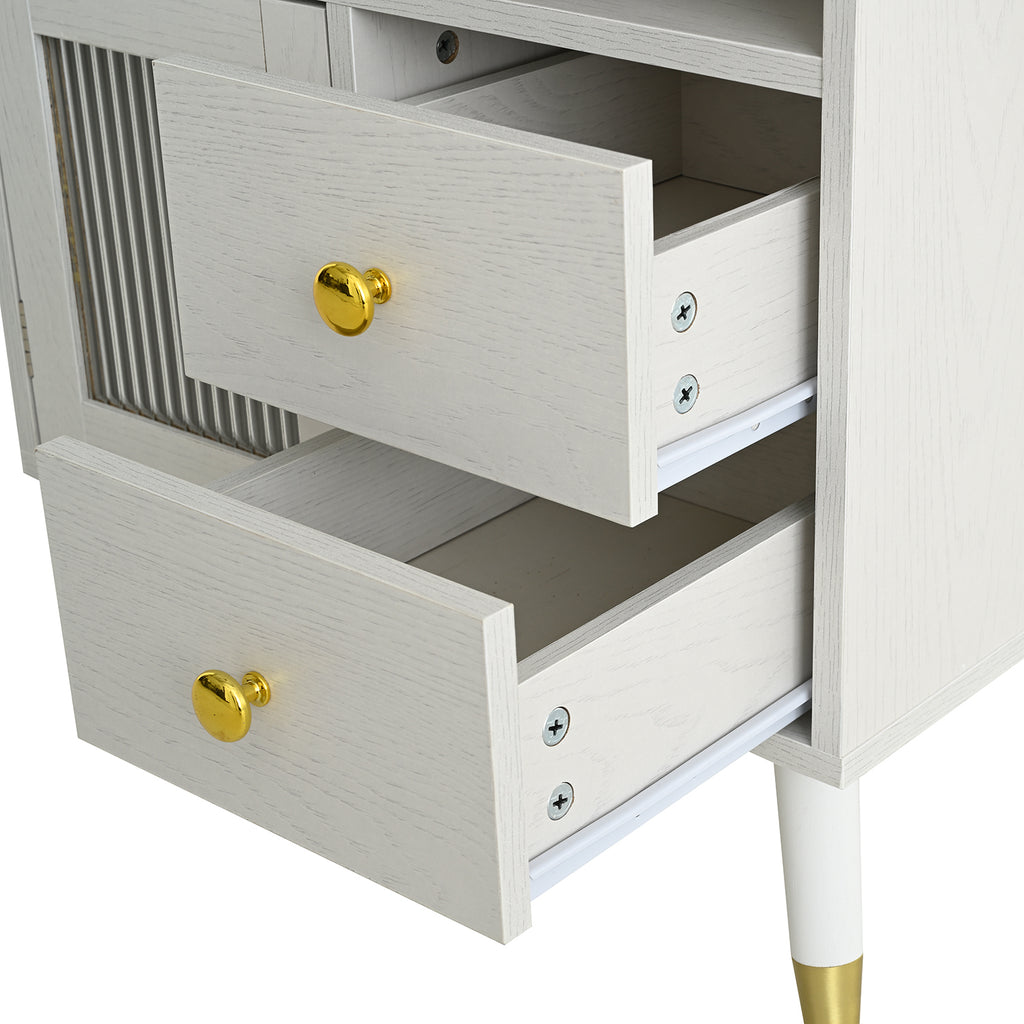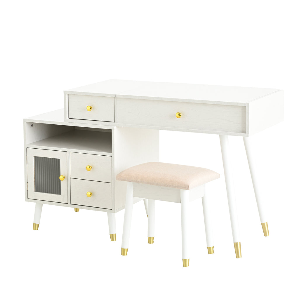 The makeup desk seamlessly blends practicality with aesthetic appeal. You can find the perfect place for any of your comestic, skin products or makeup tools.The dresser combines white wood-grain finish with golden metal pulls & leg caps-perfect for small-space glam.
