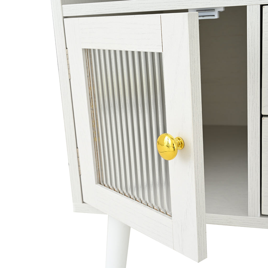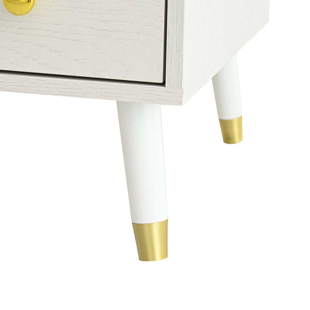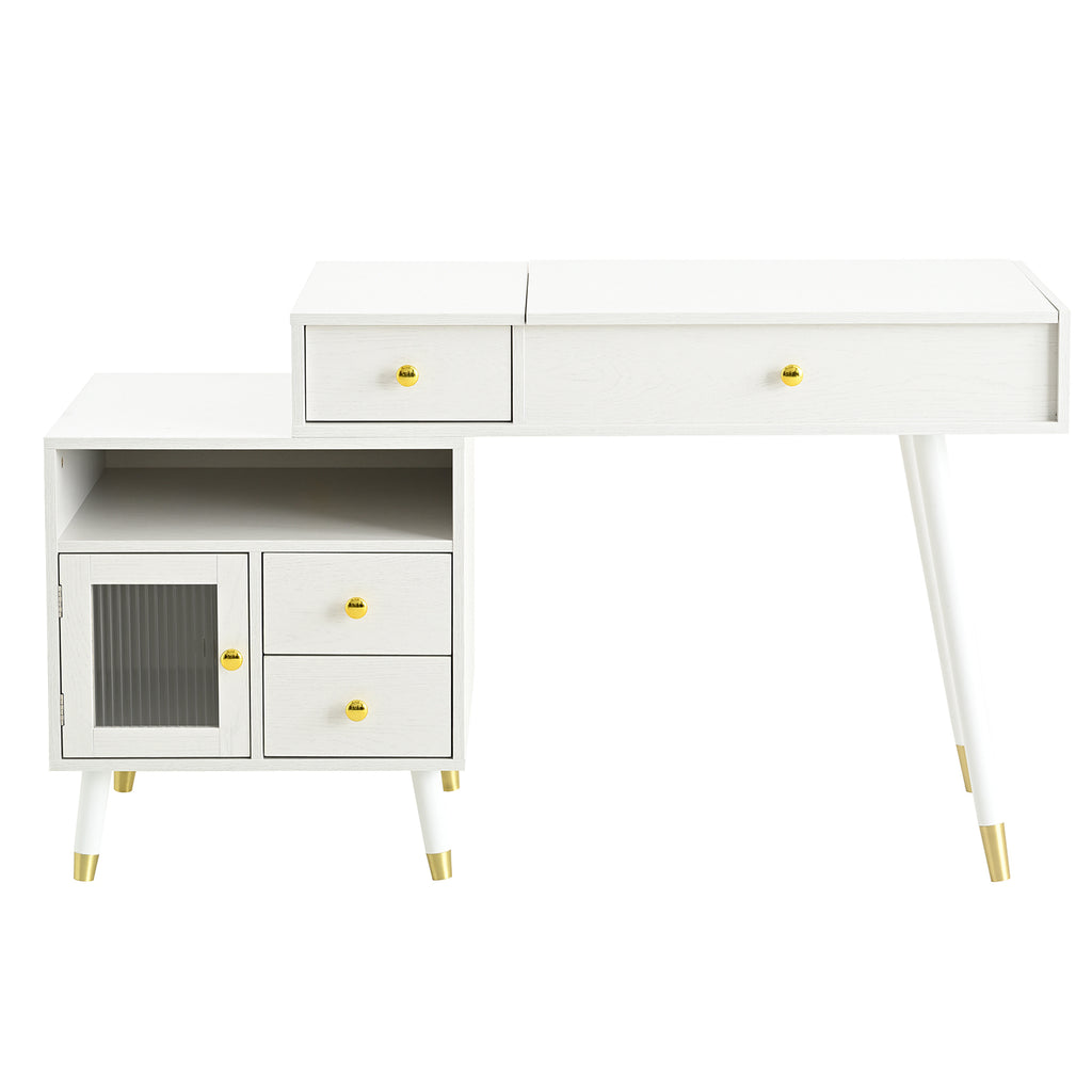 The makeup desk seamlessly blends practicality with aesthetic appeal. You can find the perfect place for any of your comestic, skin products or makeup tools.The dresser combines white wood-grain finish with golden metal pulls & leg caps-perfect for small-space glam.
