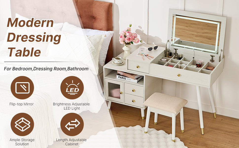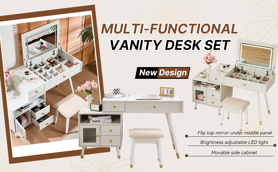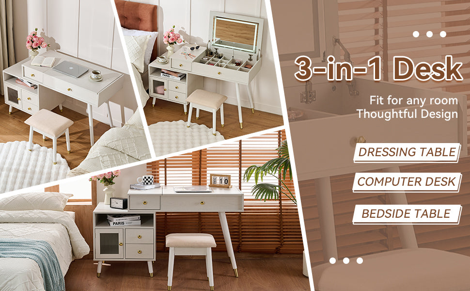 The dressing table has a fold down LED mirror under the panel, it can be easily changed to a makeup vanity or computer desk. The movable side cabinet ensure it to fit the valuable space in the room.