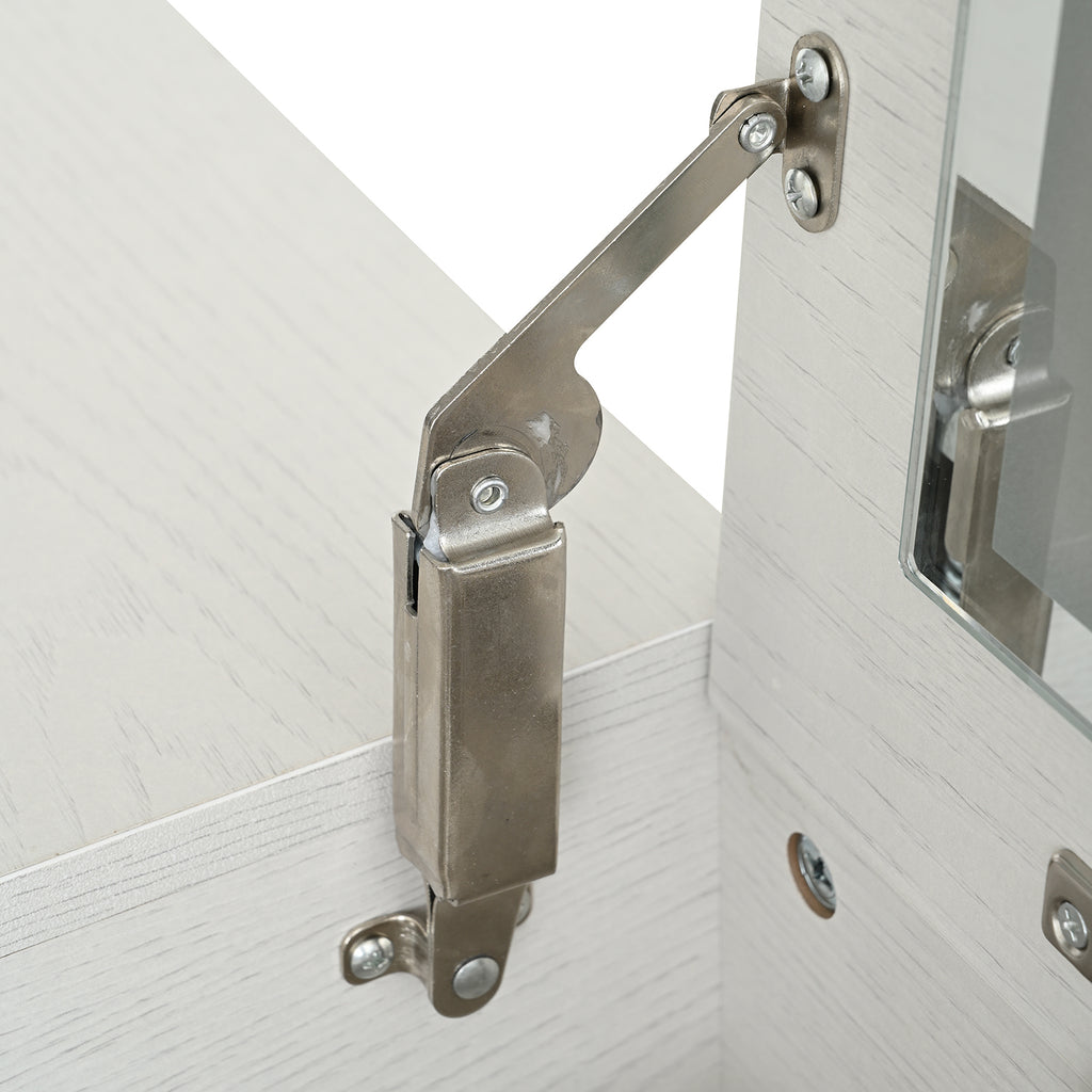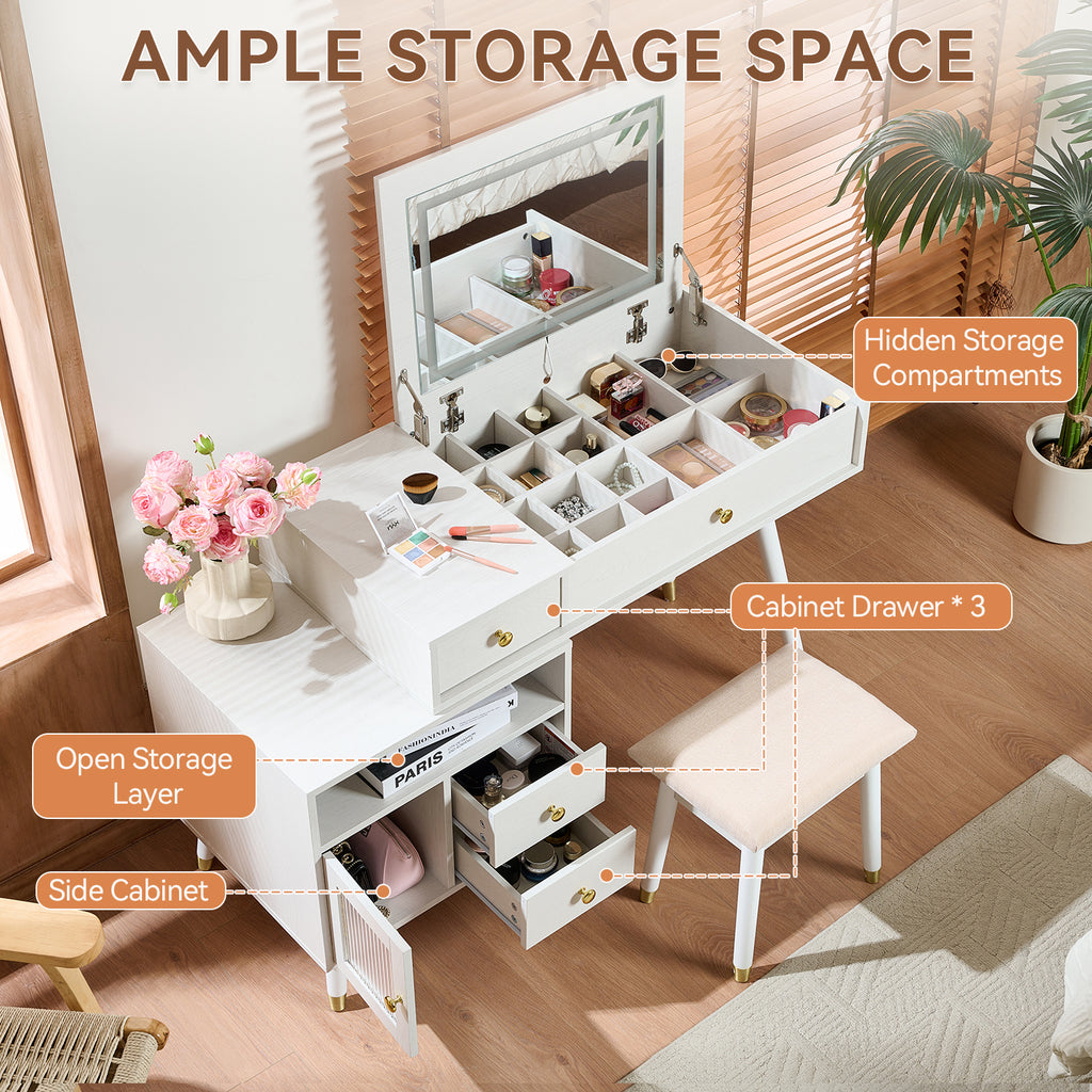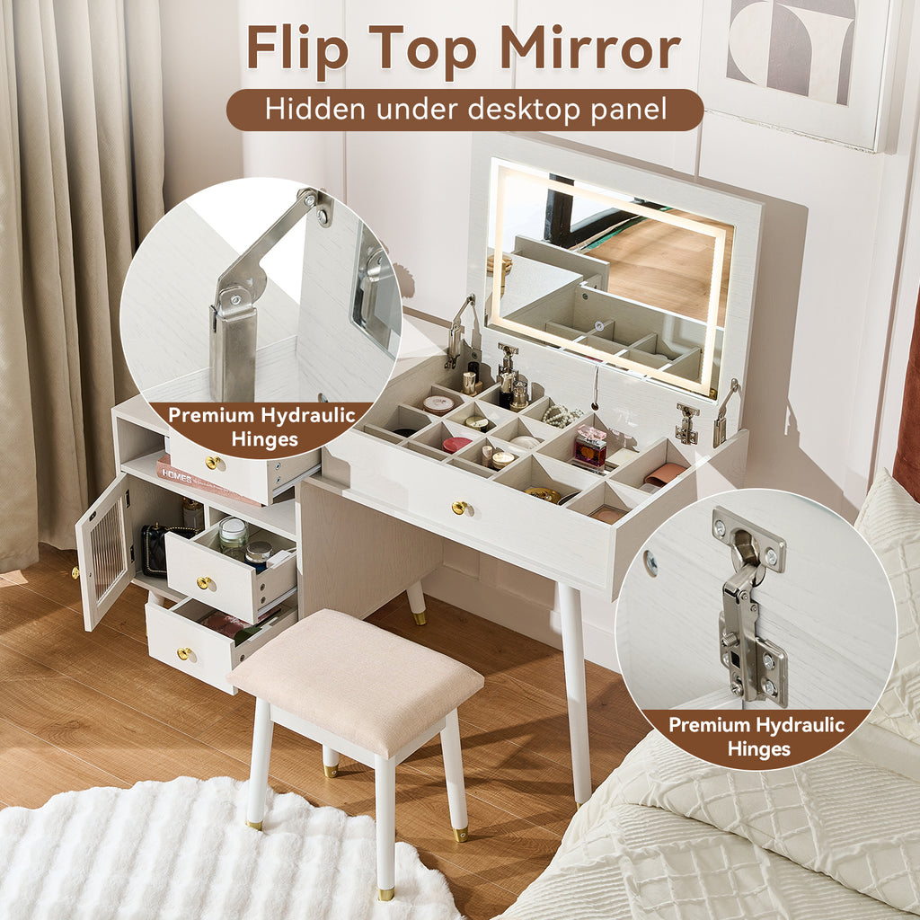 • Convenient Flip-Top Mirror:The makeup vanity features a hidden fold-down mirror under the center panel, perfect for your daily beauty routine. Equipped with two smooth hydraulic hinges, the mirror panel ensures safety without pinching fingers during opening and closing.