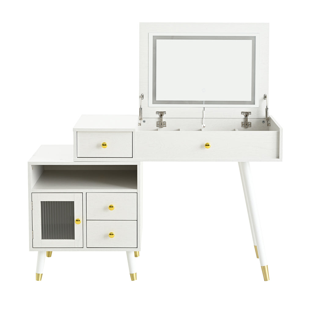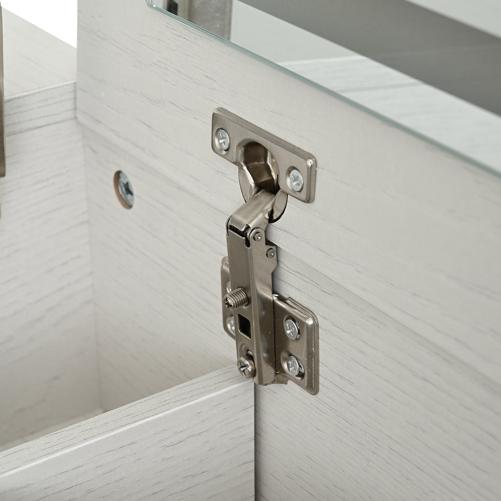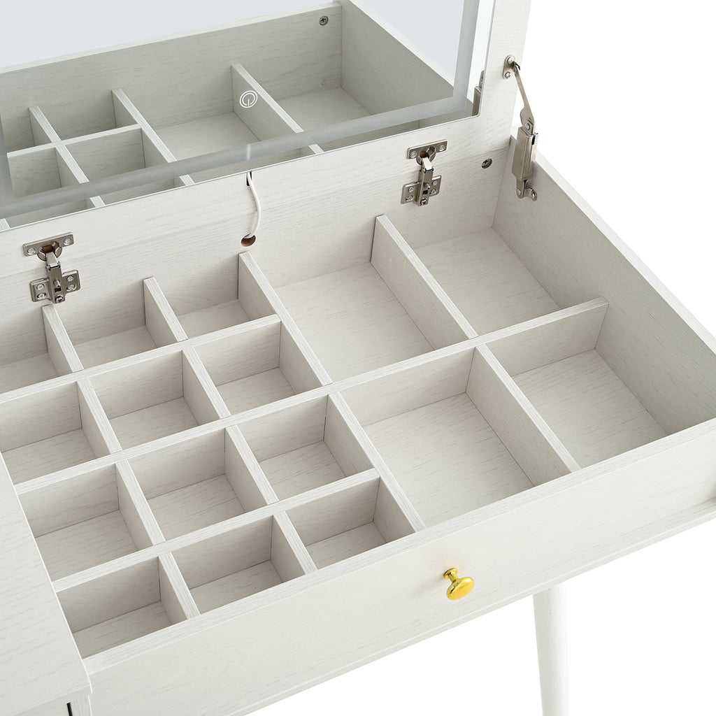 • Convenient Flip-Top Mirror:The makeup vanity features a hidden fold-down mirror under the center panel, perfect for your daily beauty routine. Equipped with two smooth hydraulic hinges, the mirror panel ensures safety without pinching fingers during opening and closing.