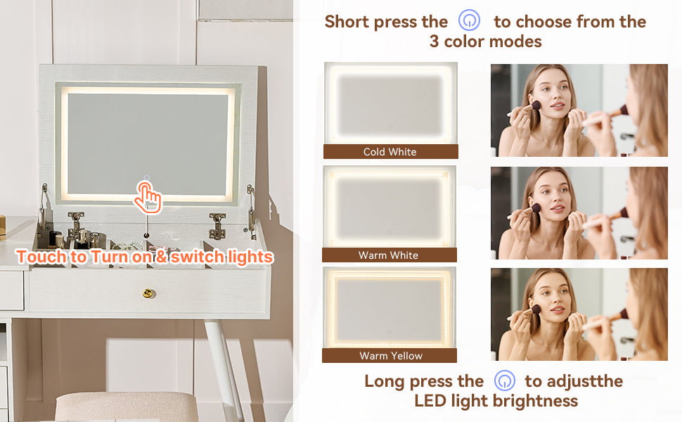 • 3-Color LED Light: The dressing table features a hidden dimmable lighting mirror under the center panel with 3 modes, including natural, warm and cool light.You could switch to meet different makeup needs.