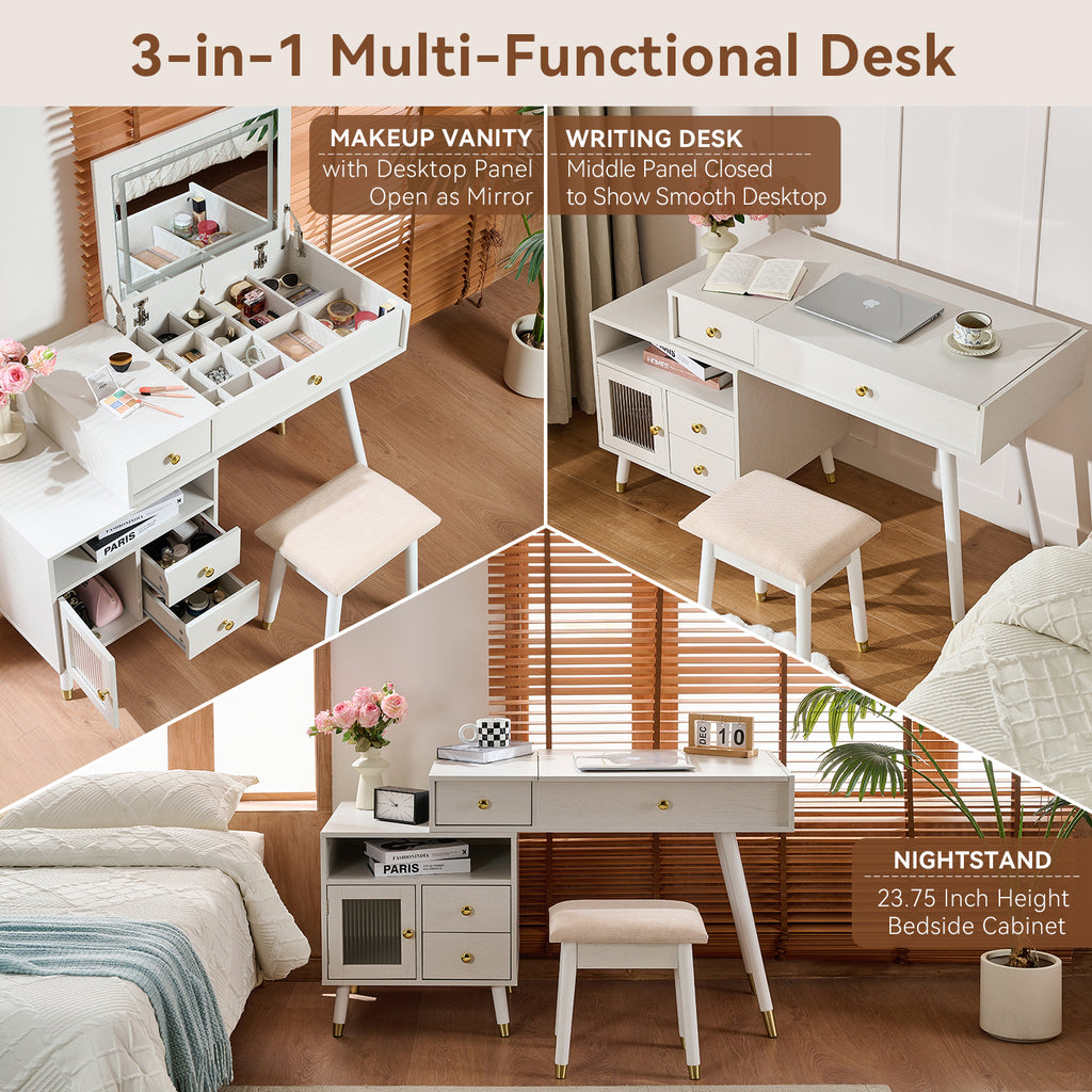 • 3-in-1 Versatile Design: This multi-functional piece combines a vanity, writing desk, and nightstand in one. When the lid is down, it serves as a convenient workspace for your laptop. Lift the hidden mirror to transform it into a vanity, with small compartments ideal for storing jewelry and cosmetics. The side cabinet, standing at 23.46 inches tall, is perfect as a nightstand beside your bed.
