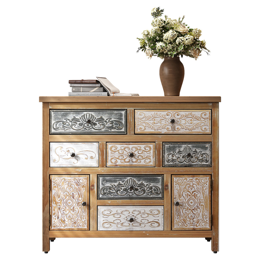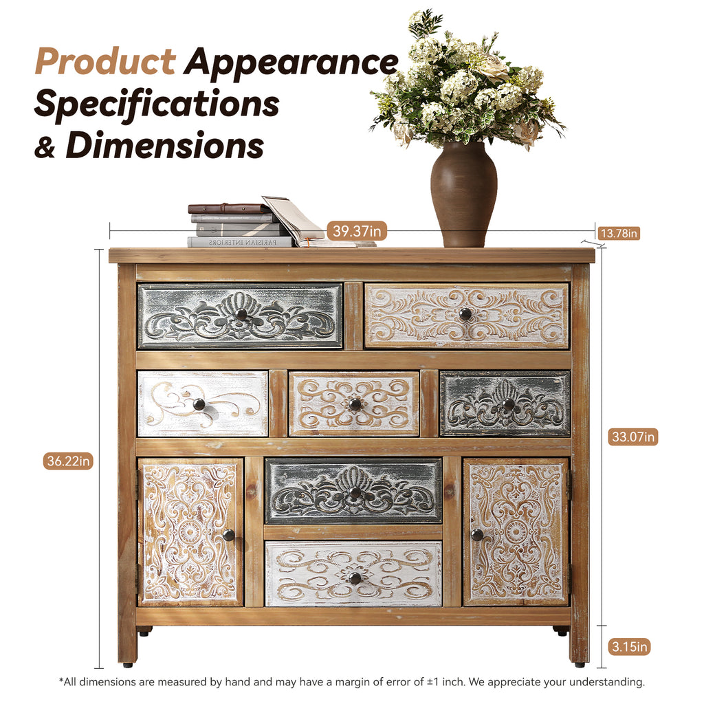 Vintage Wooden Accent Chest with 7 Drawers & 2 Cabinets, Rustic Multicolor Carved Storage Dresser for Living Room, Bedroom, Entryway, Farmhouse Style Decor (39.37' L x 13.78' W x 36.22' H)