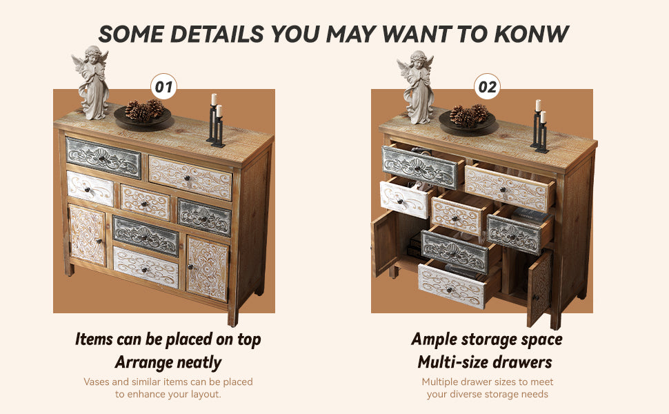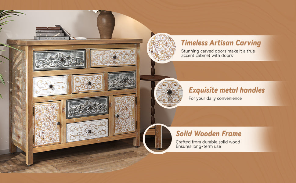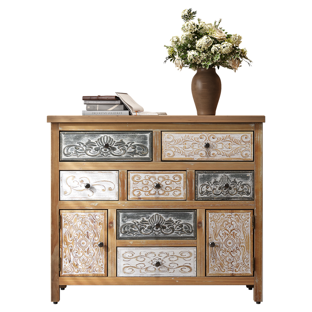 • Unique Vintage Design: Features multicolor carved patterns on drawers and cabinets, blending rustic, farmhouse, and bohemian styles. The distressed wood finish adds an antique charm, making it a statement piece for any room.