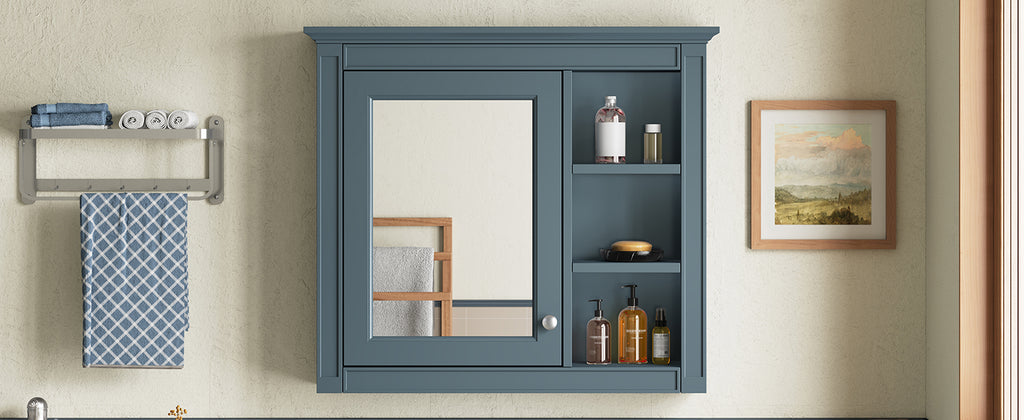 This wall-mounted mirror cabinet is made of high-quality MDF board, which is durable, environmentally friendly and odorless, ensuring long-term stable and reliable use. Equipped with a high-definition mirror, it provides a clear reflection effect, which is convenient for daily grooming. The unique design combines hidden storage and open shelves, which can effectively store sundries and keep them tidy, and display commonly used items. The height of the shelf is adjustable, which can flexibly adapt to the storage needs of different items and perfectly meet your storage needs. Whether it is a bathroom, bedroom or living room, this mirror cabinet can perfectly integrate into your home environment, improving the cleanliness of the space and convenience of use.