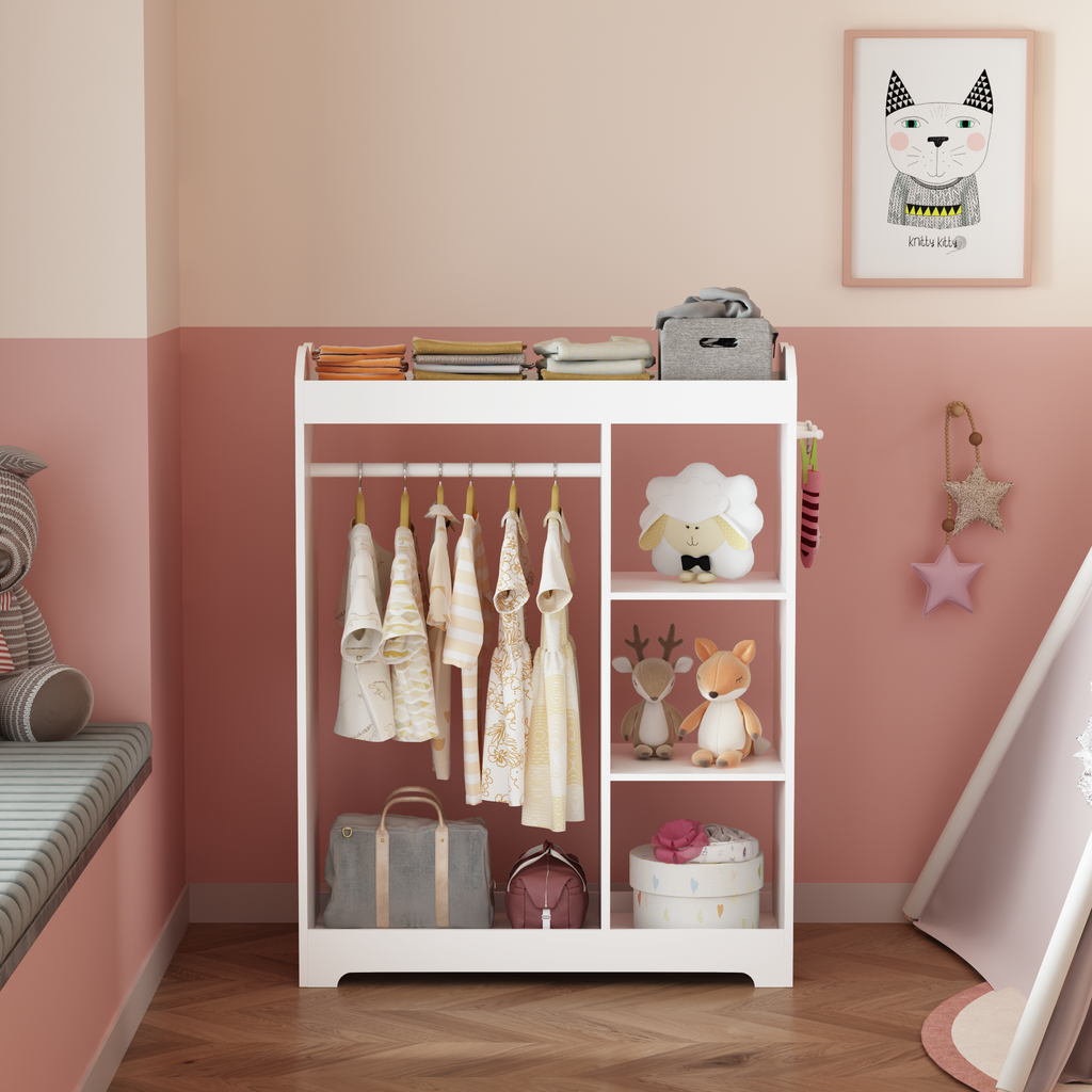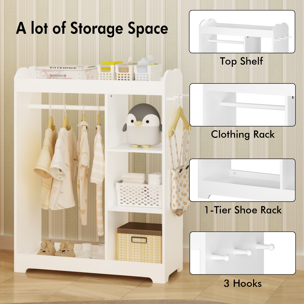 • 【Ample Storage Space】 Designed with a hanging rod for clothes, multiple open shelves for toys, books, or folded clothes, and a spacious bottom area for bags or shoes—helping kids keep everything in place.