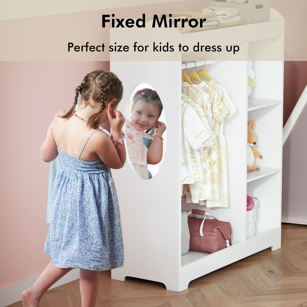 Kids Dress Up Storage with Mirror and Hooks, Wooden Dress Up Clothes Rack with Hanging Rod, 3 Side Hooks, Storage Shelves and Top Shelf, Toddler Costume Organizer for Playroom Bedroom Nursery – White