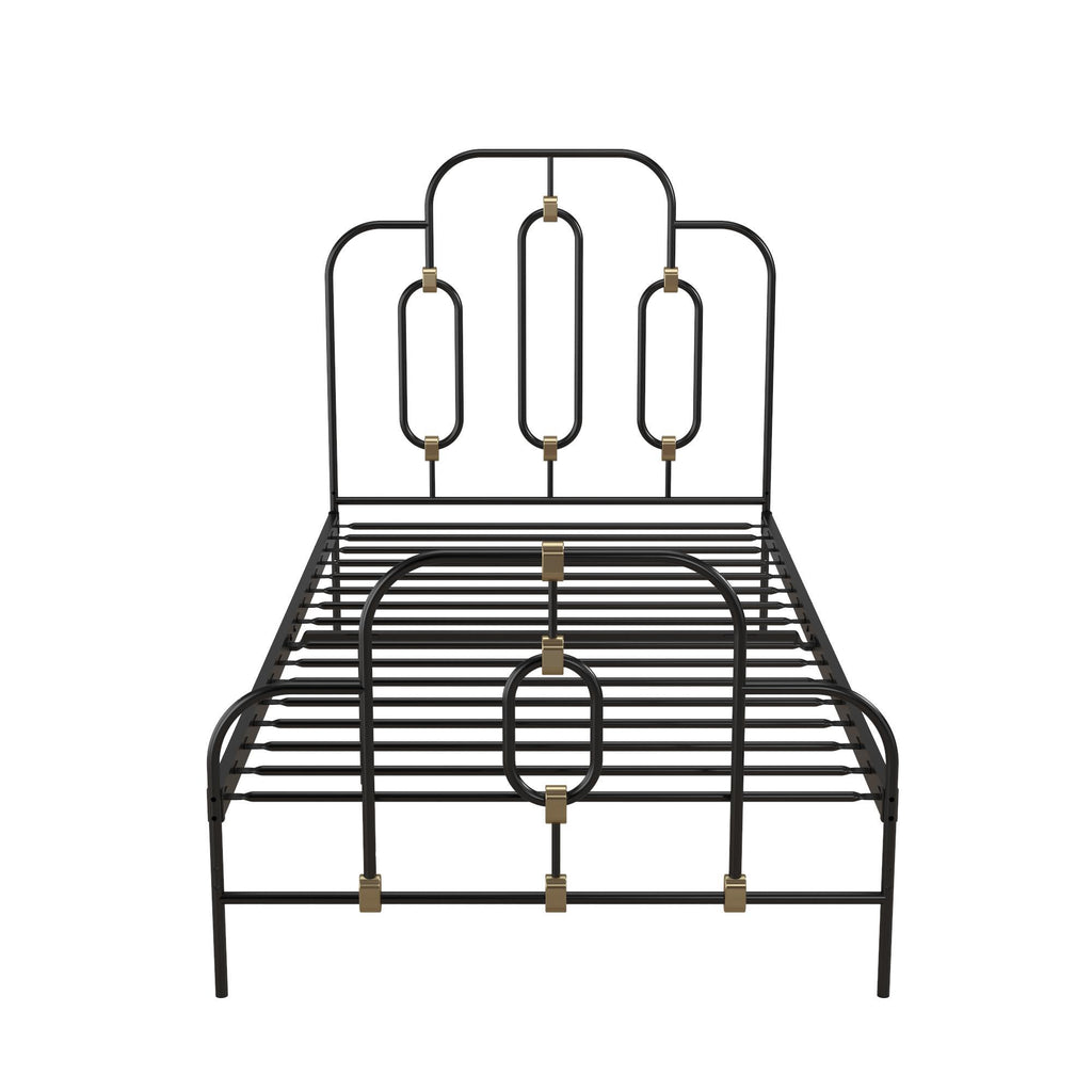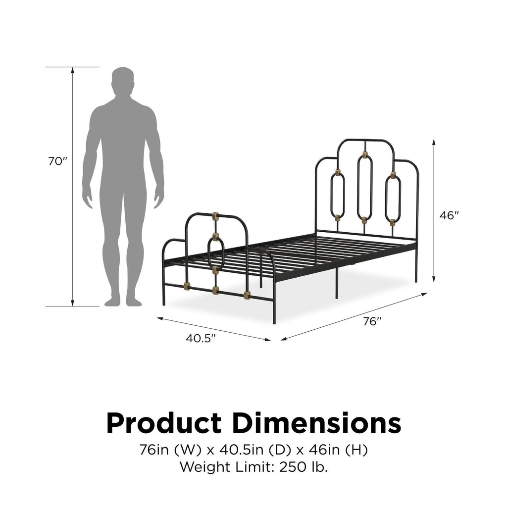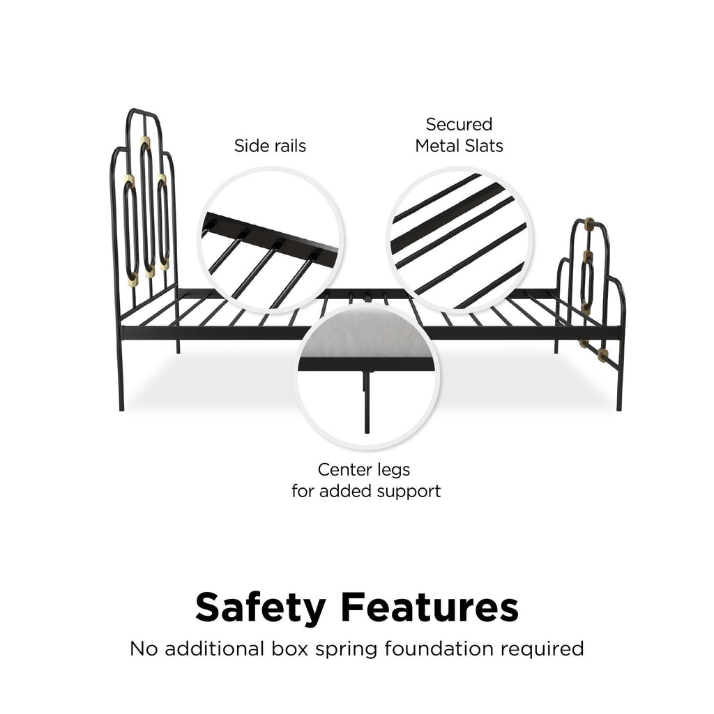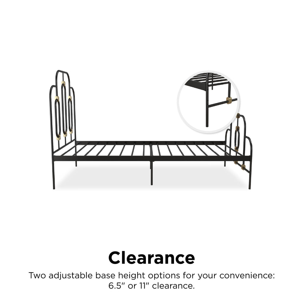 The Olivia Metal Bed is a showstopper. Its design features a statement headboard and footboard with gold detailing that give the all-metal frame a vintage design with a touch of modern flair to fit with today's interior décor trends. The Olivia's sturdy frame includes side rails, additional center legs and secure slats to provide utmost support and stability for you and your mattress! Thanks to that slats, you also don't need to purchase any additional box spring or foundation. The Olivia's most functional feature is its adjustable base height. This means that, depending on your storage needs, you can adjust the bed frame between a 6.5' or 11' clearance to provide the perfect amount of under bed storage for you! Mattress sold separately. Ships in one box and assembles quickly.