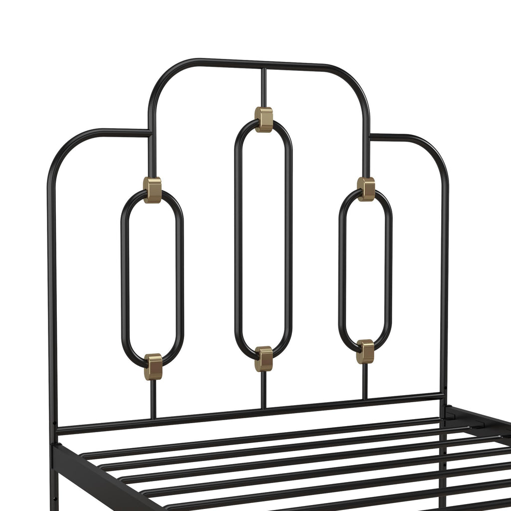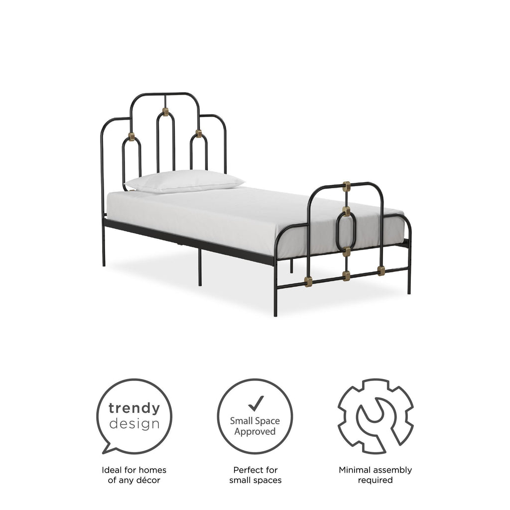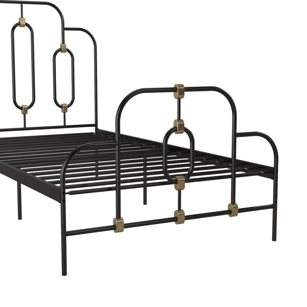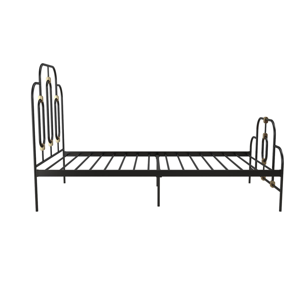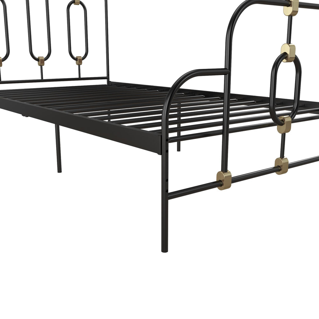 The Olivia Metal Bed is a showstopper. Its design features a statement headboard and footboard with gold detailing that give the all-metal frame a vintage design with a touch of modern flair to fit with today's interior décor trends. The Olivia's sturdy frame includes side rails, additional center legs and secure slats to provide utmost support and stability for you and your mattress! Thanks to that slats, you also don't need to purchase any additional box spring or foundation. The Olivia's most functional feature is its adjustable base height. This means that, depending on your storage needs, you can adjust the bed frame between a 6.5' or 11' clearance to provide the perfect amount of under bed storage for you! Mattress sold separately. Ships in one box and assembles quickly.