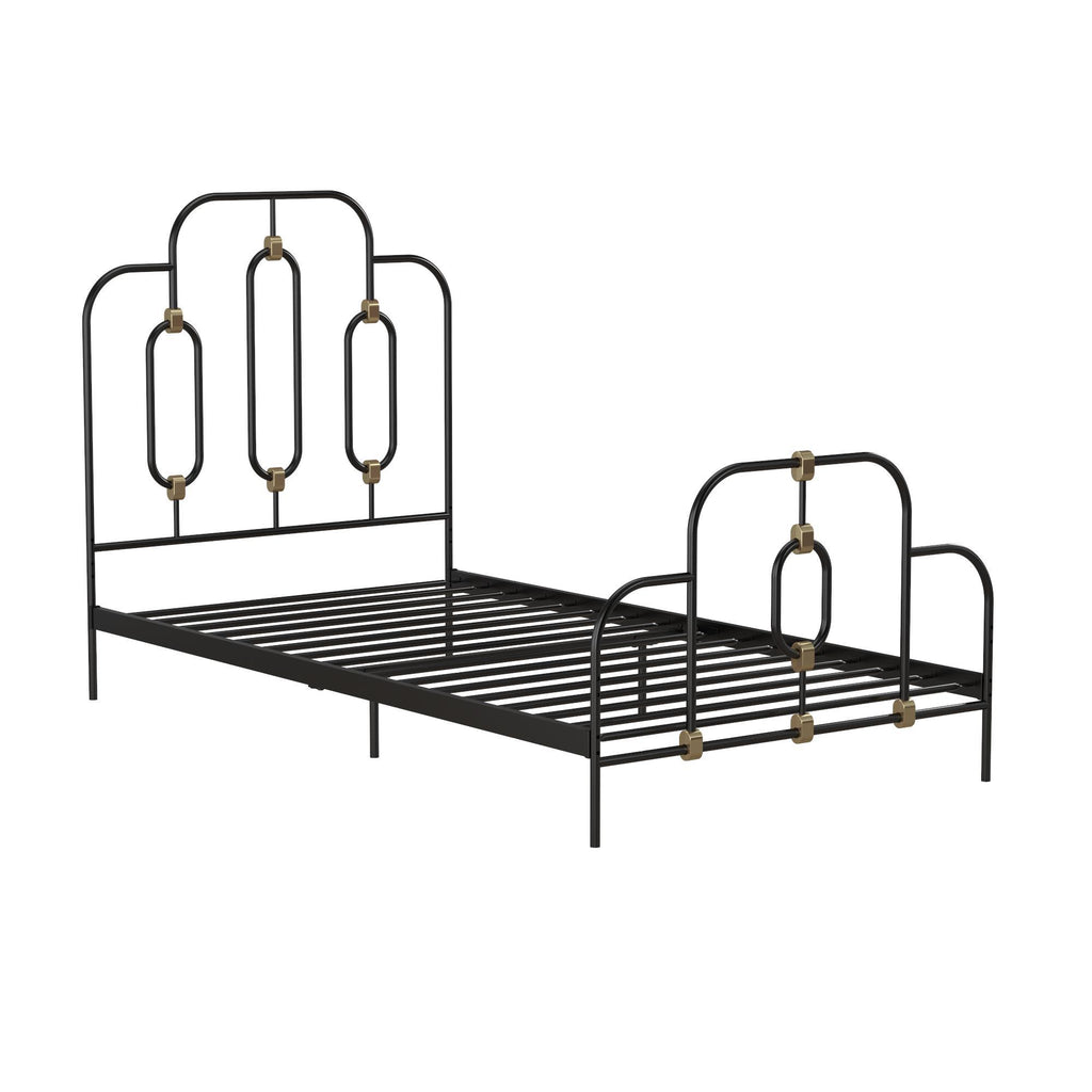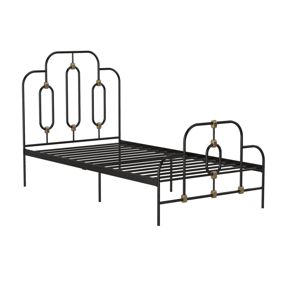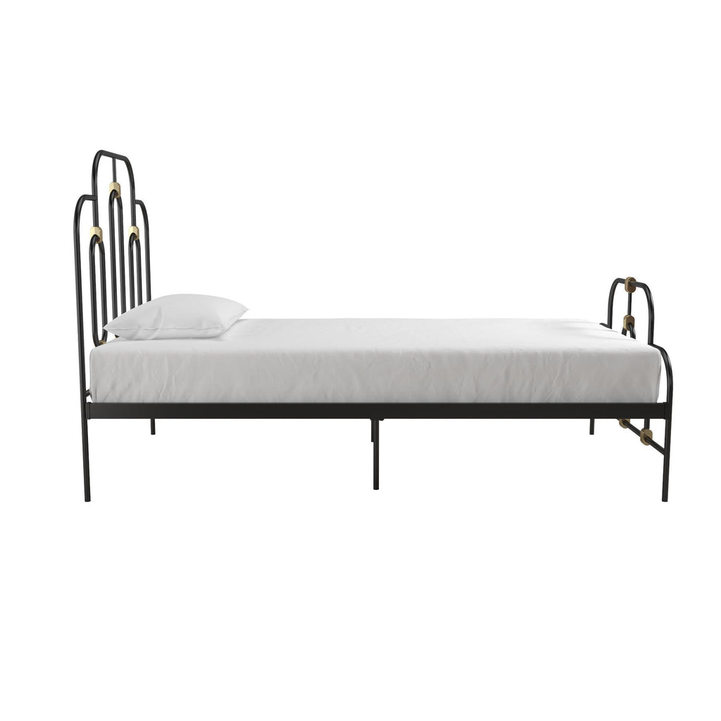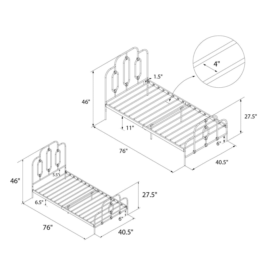 The Olivia Metal Bed is a showstopper. Its design features a statement headboard and footboard with gold detailing that give the all-metal frame a vintage design with a touch of modern flair to fit with today's interior décor trends. The Olivia's sturdy frame includes side rails, additional center legs and secure slats to provide utmost support and stability for you and your mattress! Thanks to that slats, you also don't need to purchase any additional box spring or foundation. The Olivia's most functional feature is its adjustable base height. This means that, depending on your storage needs, you can adjust the bed frame between a 6.5' or 11' clearance to provide the perfect amount of under bed storage for you! Mattress sold separately. Ships in one box and assembles quickly.