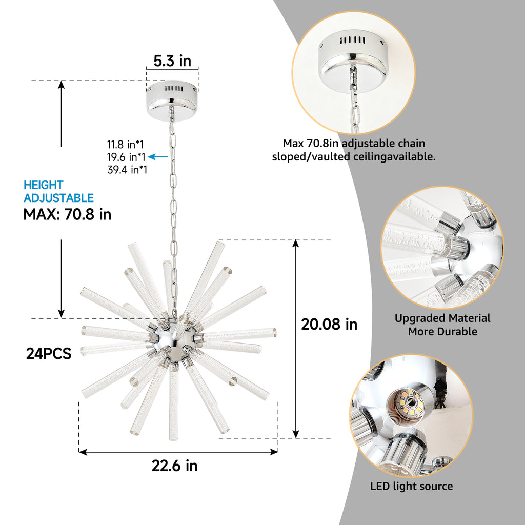 • CHANDELIER FOR HIGH CEILING: This chandelier comes with three adjustable chains ((1PCS x11.81inch, 1PCS*19.68INCH, 1PCS*39.37INCH), which allows you to flexibly adjust the height according to the height of the ceiling, allowing you to create a stunning focal point in any room, making it a conversation starter among your guests.