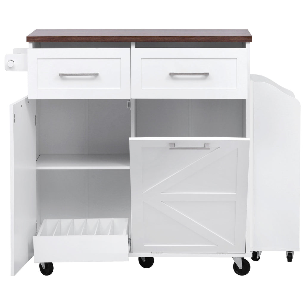 Summary This 47.2-inch wide rolling kitchen island will bring a distinctive farmhouse flavor to your kitchen space. It's made from a blend of P2-grade MDF boards, with a sleek tabletop and a unique look that will draw you in just at eye level. The dining cart has removable side shelves and a drop leaf design, and with two drawers, it offers a unique advantage in terms of storage practicality. In addition, the trash cabinet and pot organizer will surprise you. In terms of mobility, not only do the cabinets have lockable wheels underneath, but the side shelves can also be moved and used individually. We also provide replaceable wooden feet to support the island, so enjoy your kitchen space.