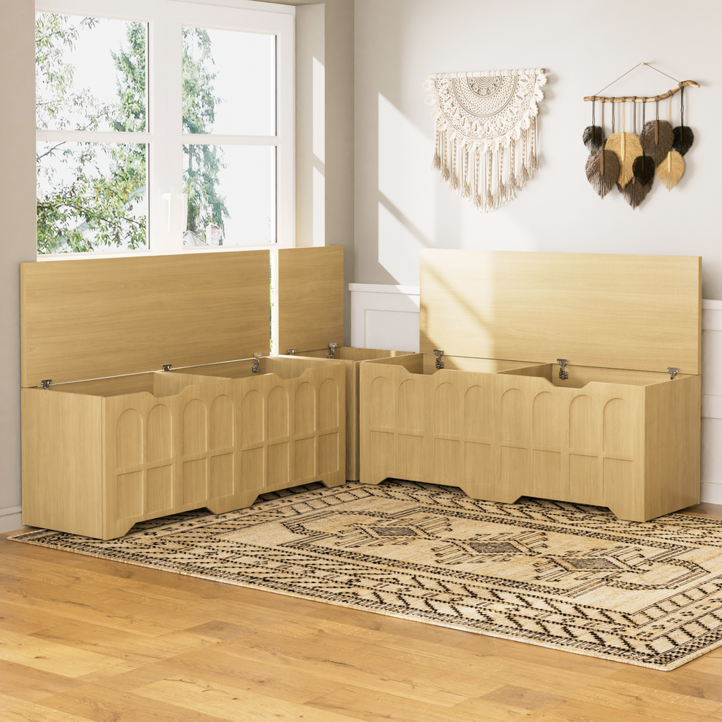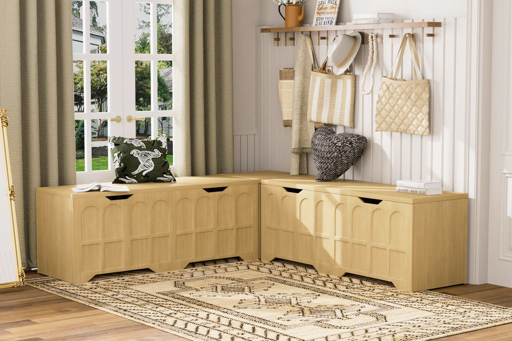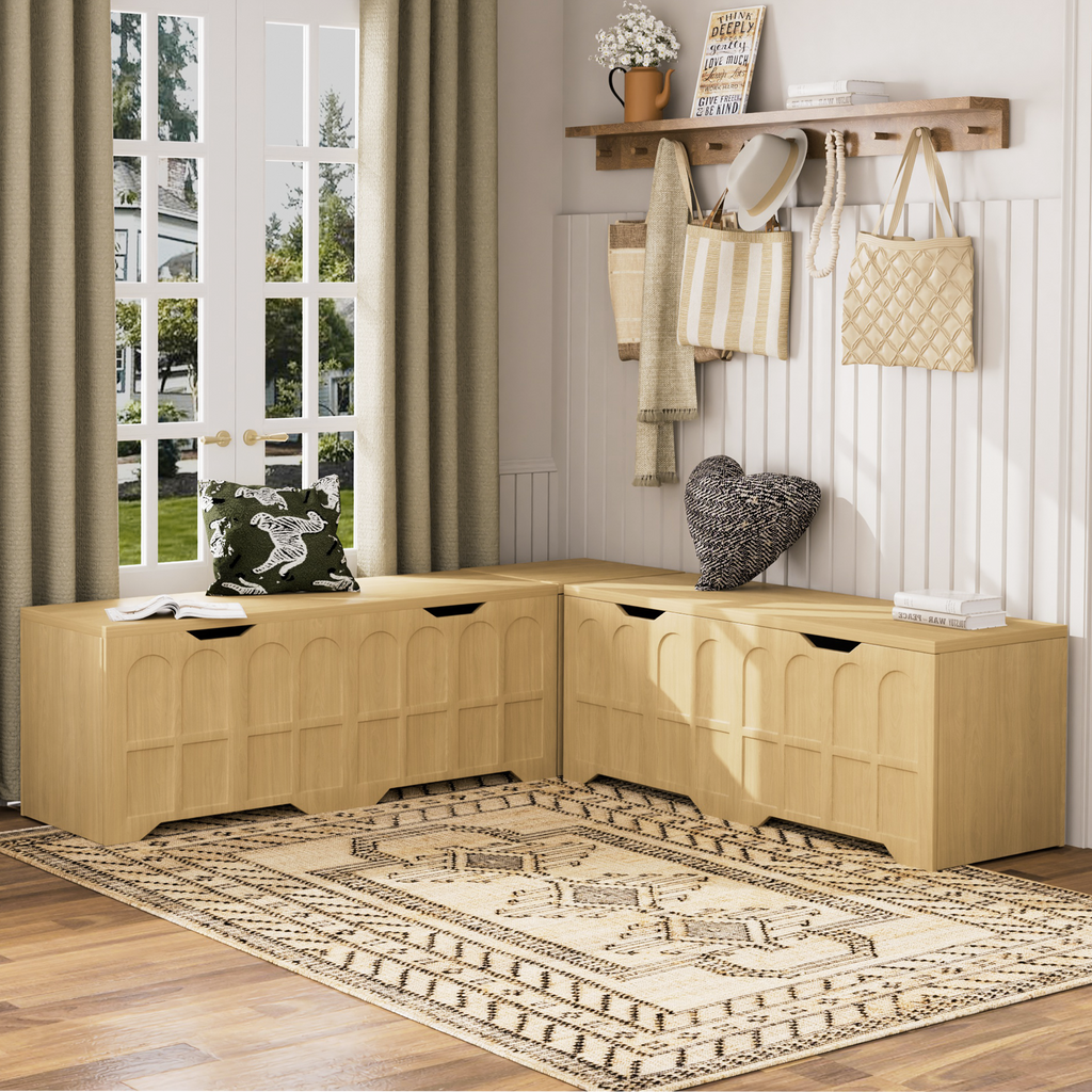 3-Piece L-shaped multifunctional storage bench with padded shoe bench, serves as a kitchen corner stool, toy storage box, or reading nook seat, natural color, 63'D x 63'W x 19.1'H