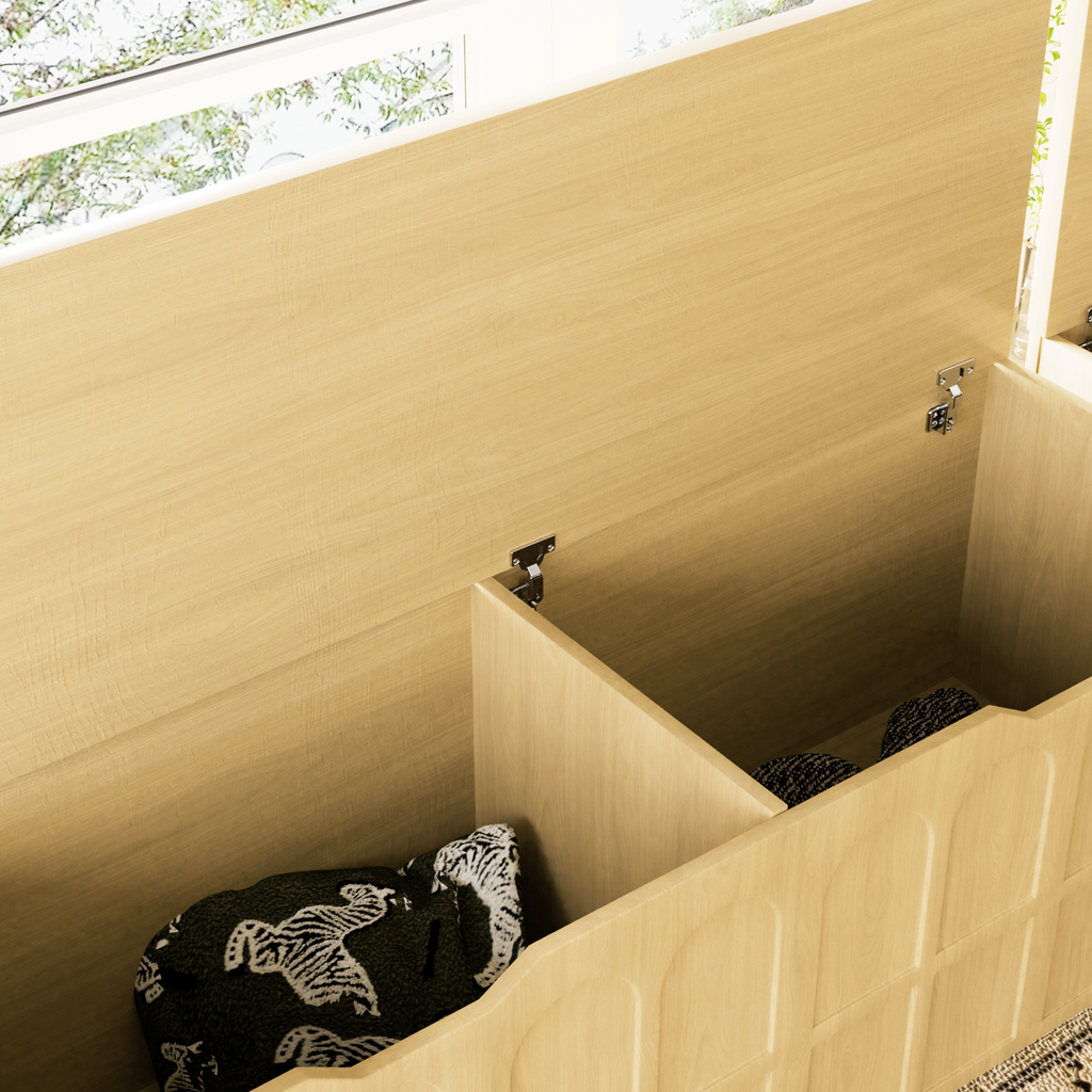 • Exquisite Details · Durable Quality: Crafted from premium MDF panels for a sturdy structure with exceptional load-bearing capacity. The wooden cover plate features metal clasps for smooth, effortless opening and closing, while its minimalist design embodies modern simplicity.