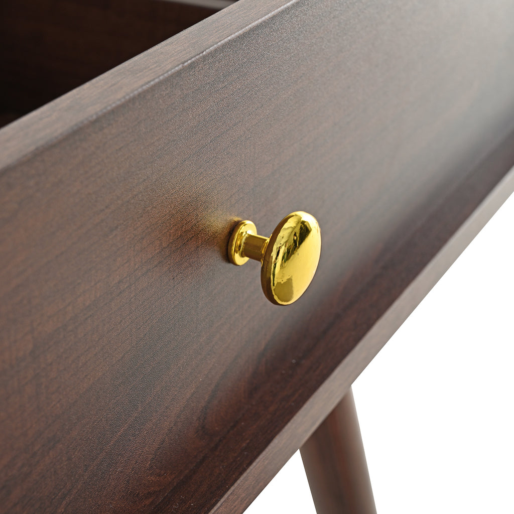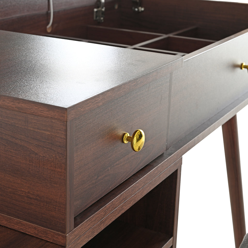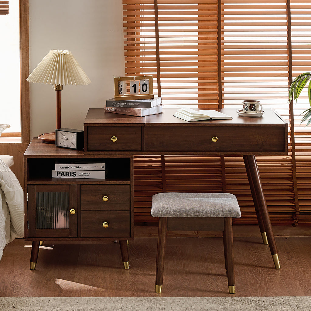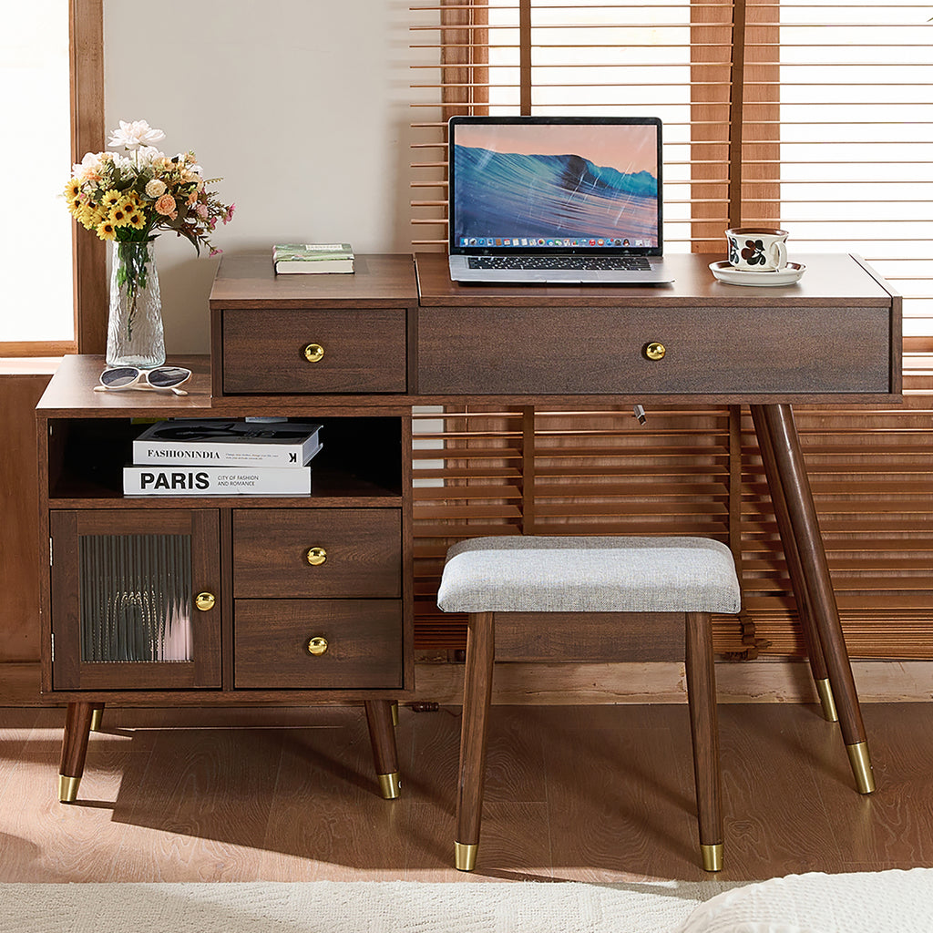 The make up desk seamlessly blends practicality with aesthetic appeal. You can find the perfect place for any of your comestic, skin products or makeup tools. The dresser blends walnut wood-grain finish with luxe gold-tone pulls & leg caps—perfect for small-space glam.