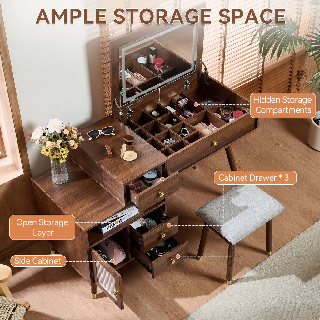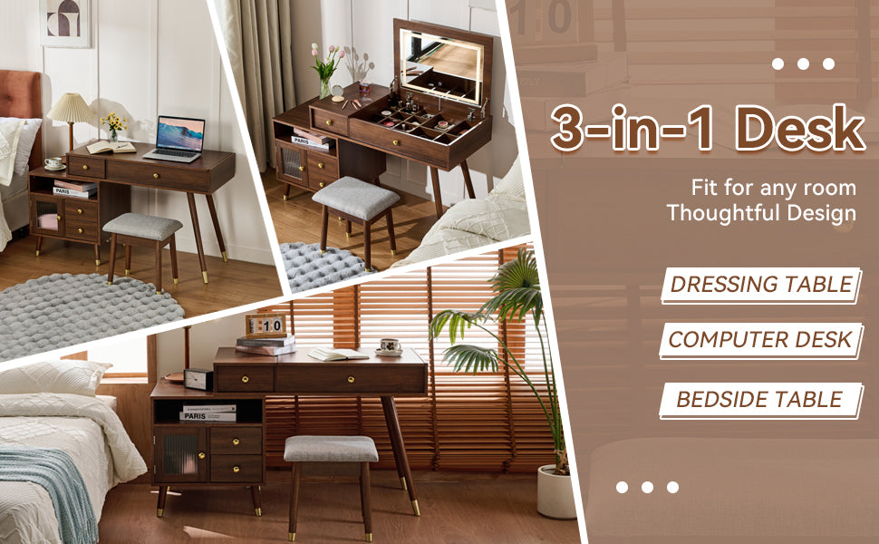 3-in-1 Vanity Desk with Lighted Flip-Top Mirror & Adjustable Cabinet, Makeup Dressing Table with Stool, Dresser with Drawers for Bedroom, Walnut