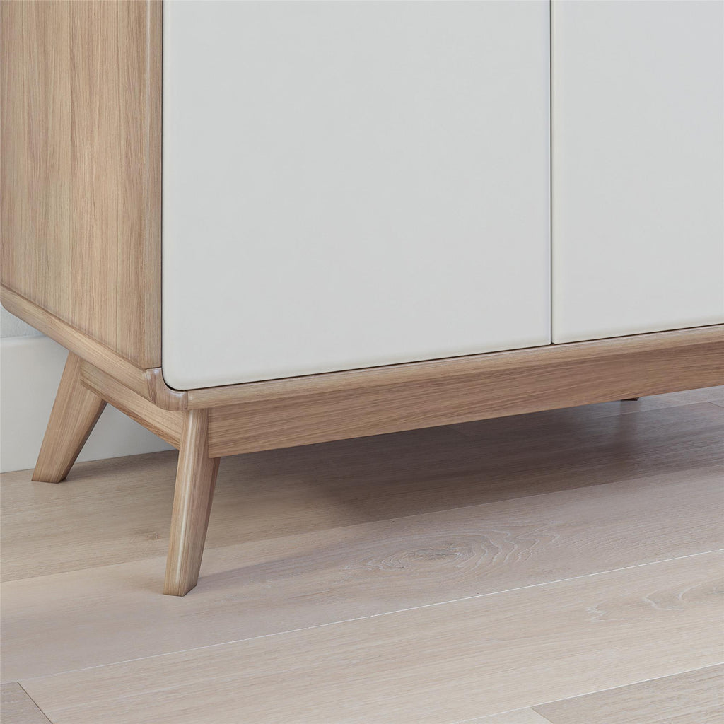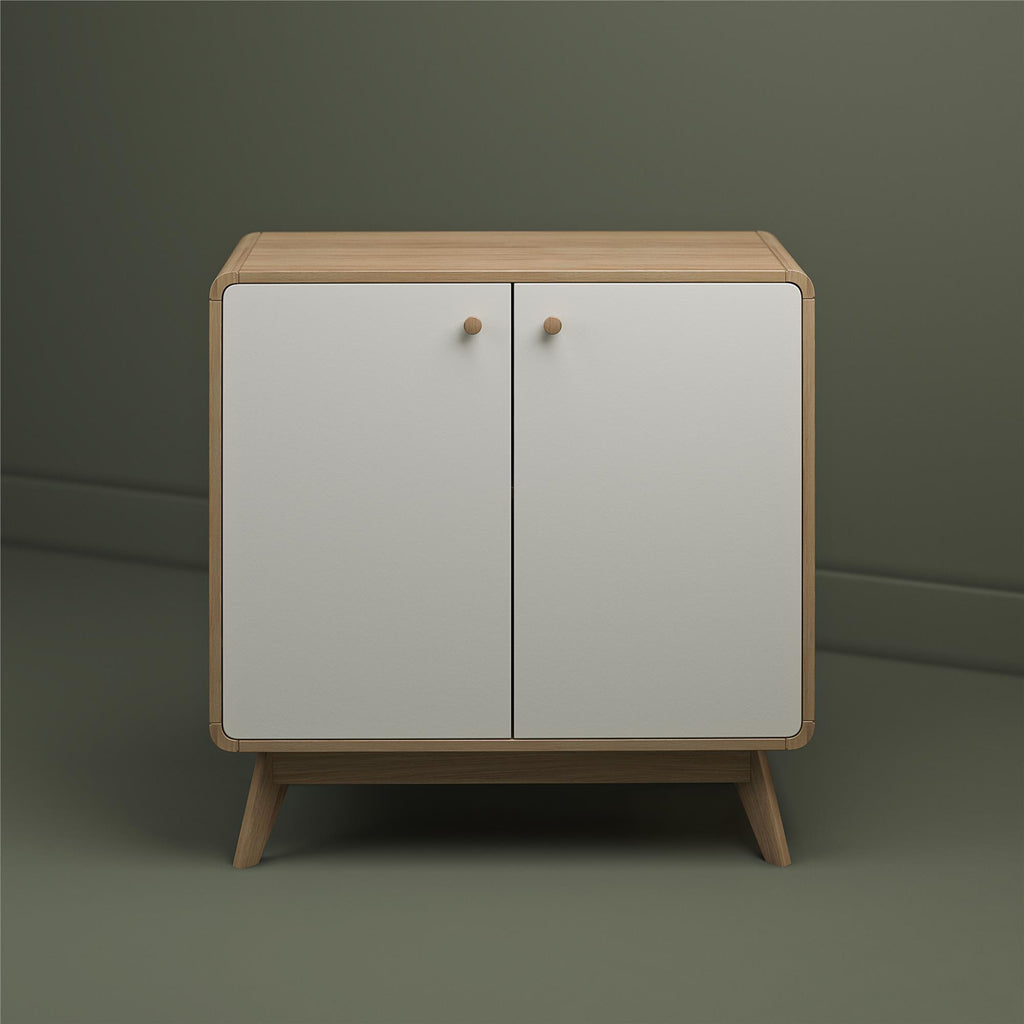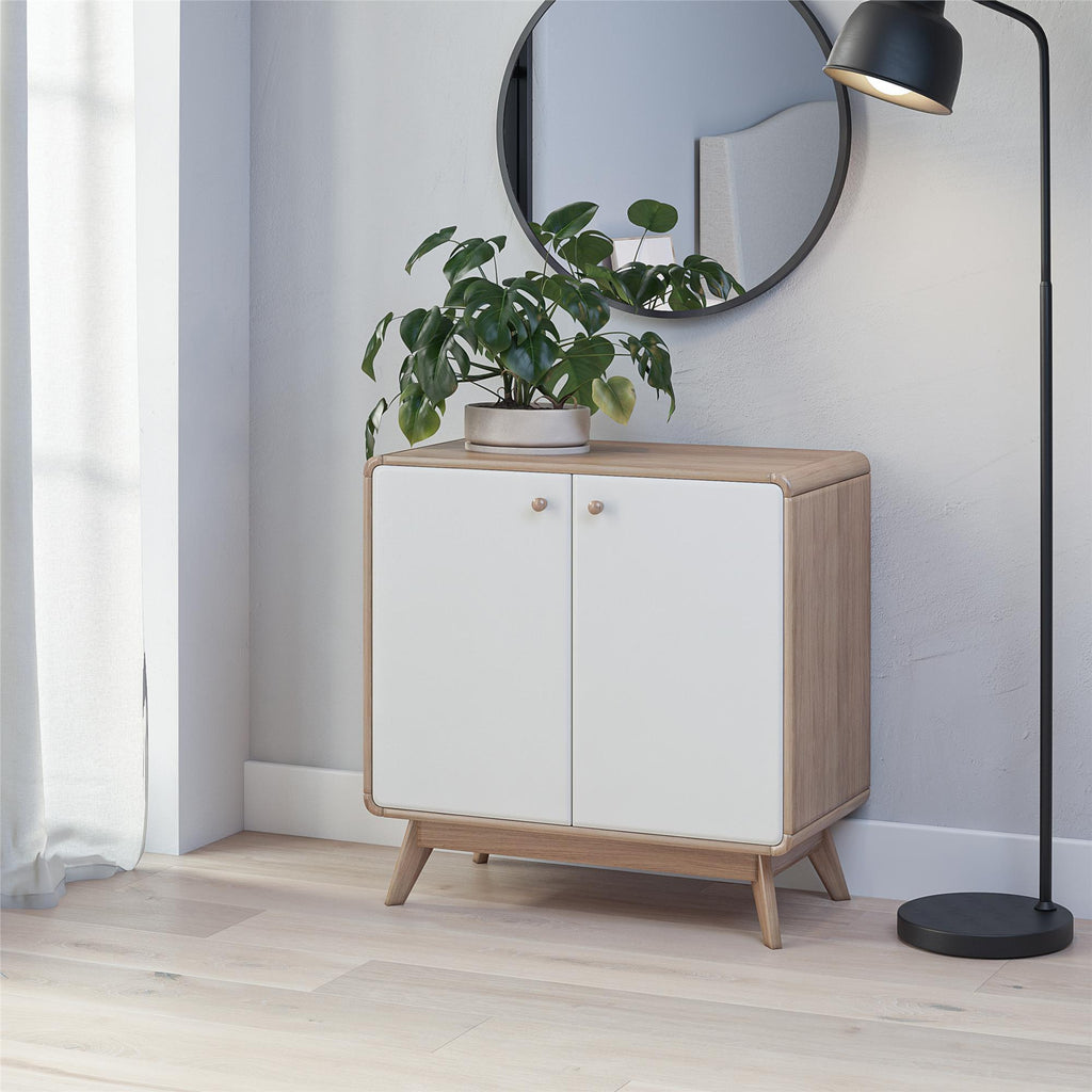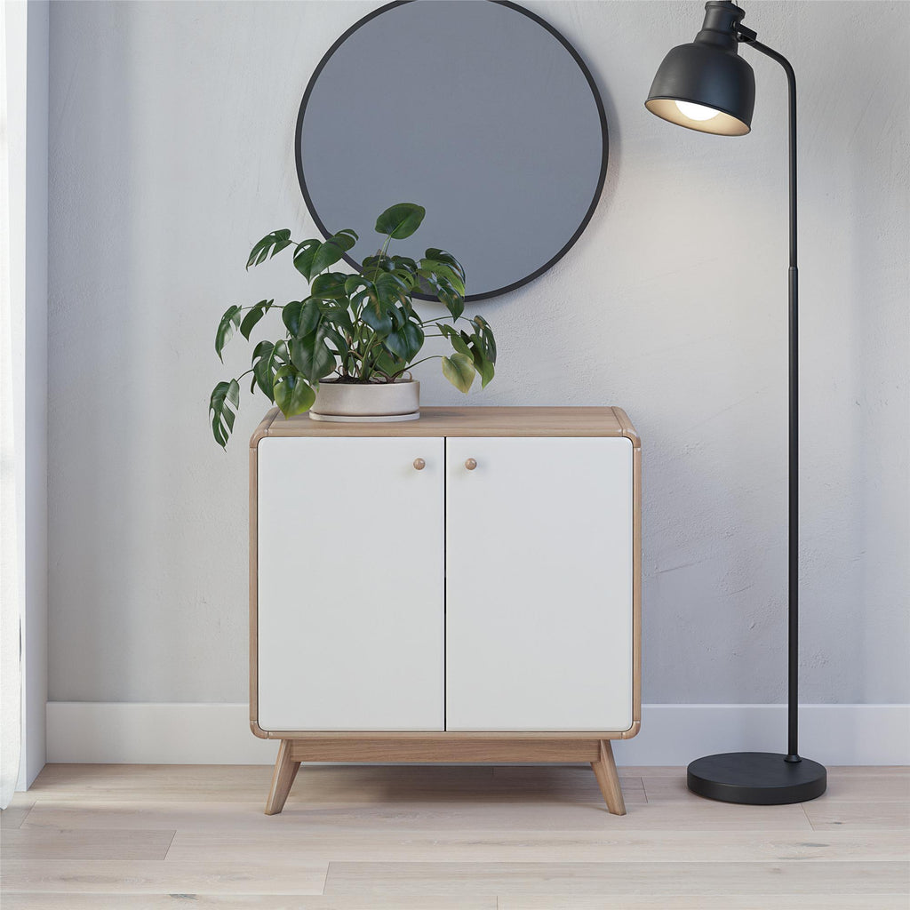 In the hustle and bustle of everyday life, keeping your home tidy and organized can be a challenge. The Leva Accent Cabinet is designed to bring Scandinavian-style simplicity and modern elegance to your living space. This wide accent cabinet, perfect for sideboard buffet storage, combines functionality with style. Crafted from sturdy engineered wood, it features a two-tone Mid-Century inspired design with rounded edges and a natural finish splayed legged wooden base. The freestanding, 2-door buffet cabinet with shelves offers ample storage for books, dishes, and games, while the wooden knob handles and concealed hinges ensure stability and ease of use. Ideal for the living room, home office, or entryway, its neutral color and condo-friendly size make it a versatile addition to any home. Simple assembly and easy maintenance add to its appeal. Available in other colors to suit your style, this retro-chic piece is the epitome of contemporary elegance.