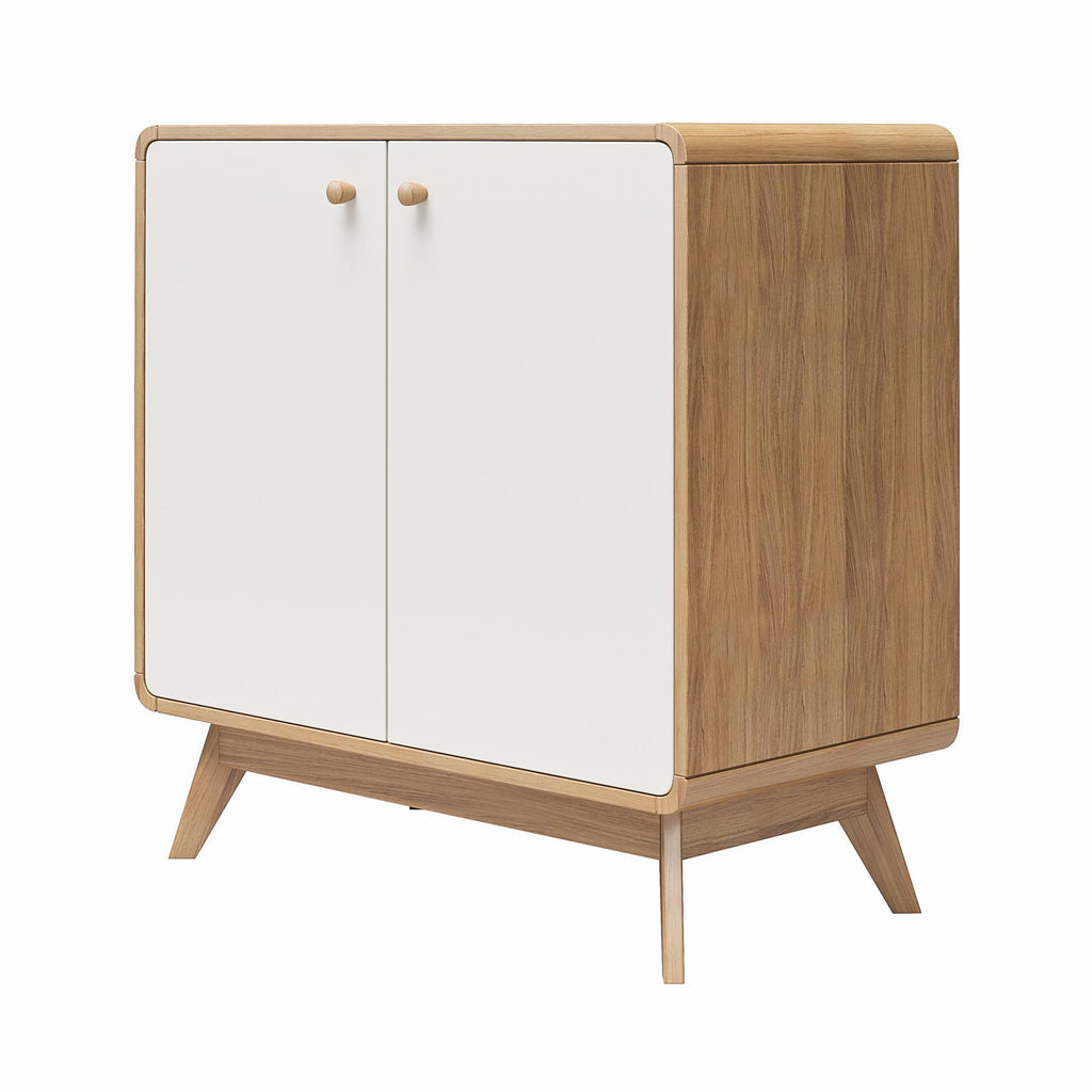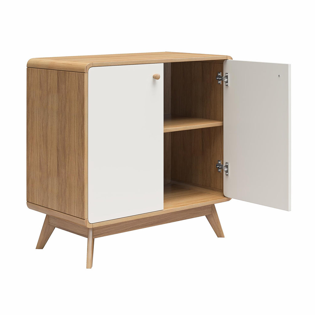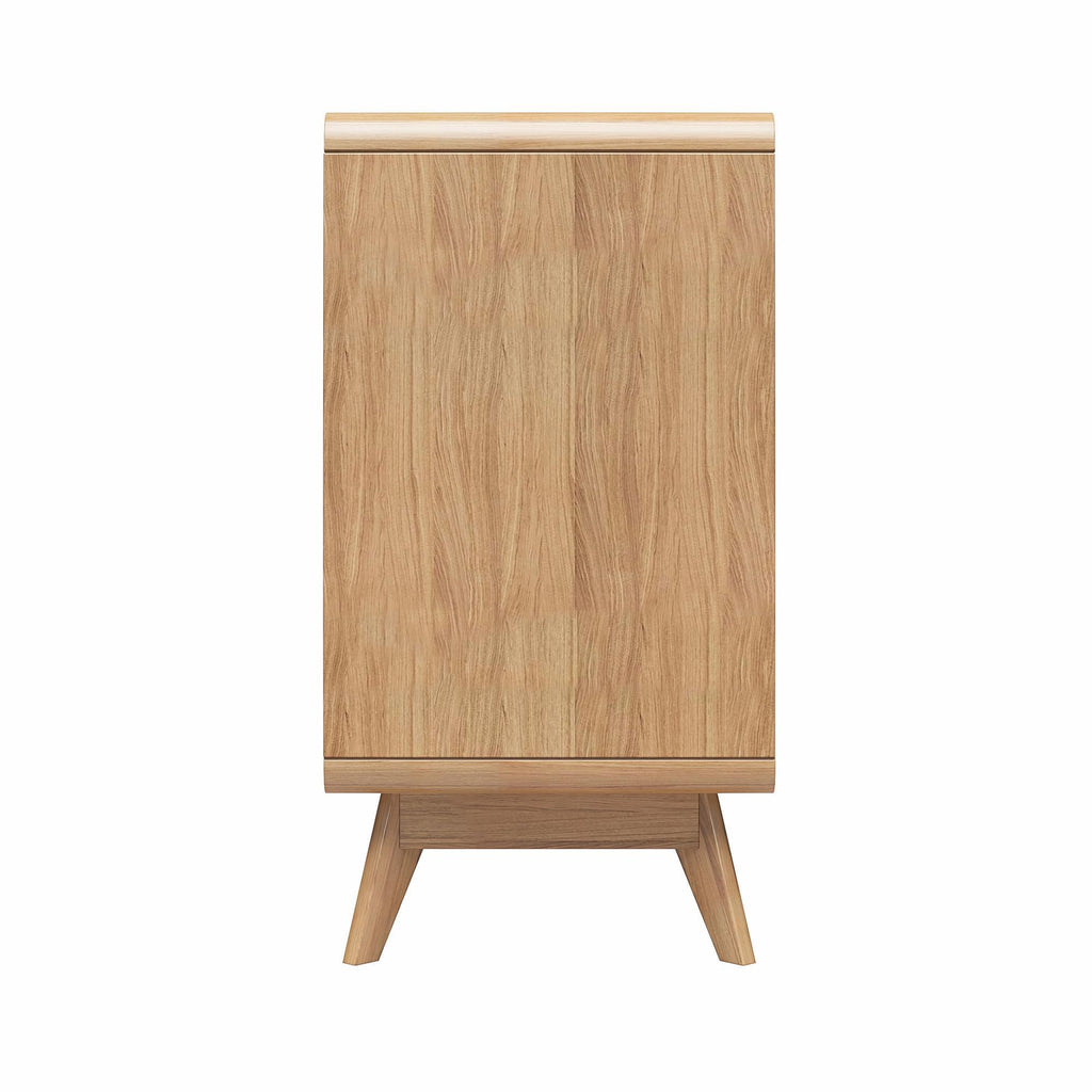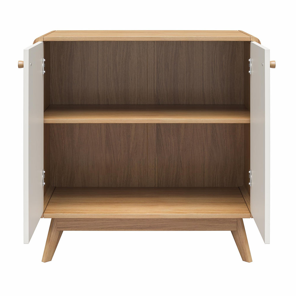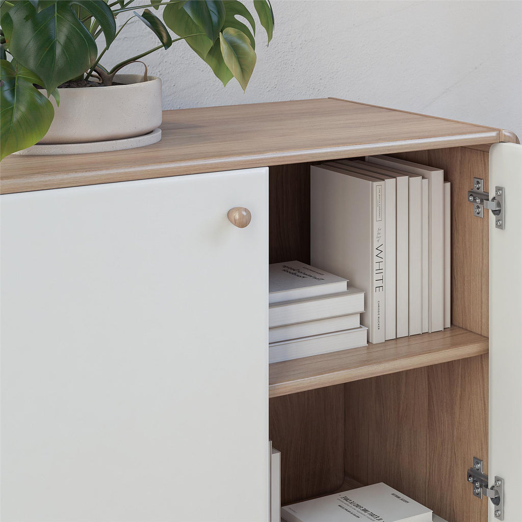 In the hustle and bustle of everyday life, keeping your home tidy and organized can be a challenge. The Leva Accent Cabinet is designed to bring Scandinavian-style simplicity and modern elegance to your living space. This wide accent cabinet, perfect for sideboard buffet storage, combines functionality with style. Crafted from sturdy engineered wood, it features a two-tone Mid-Century inspired design with rounded edges and a natural finish splayed legged wooden base. The freestanding, 2-door buffet cabinet with shelves offers ample storage for books, dishes, and games, while the wooden knob handles and concealed hinges ensure stability and ease of use. Ideal for the living room, home office, or entryway, its neutral color and condo-friendly size make it a versatile addition to any home. Simple assembly and easy maintenance add to its appeal. Available in other colors to suit your style, this retro-chic piece is the epitome of contemporary elegance.