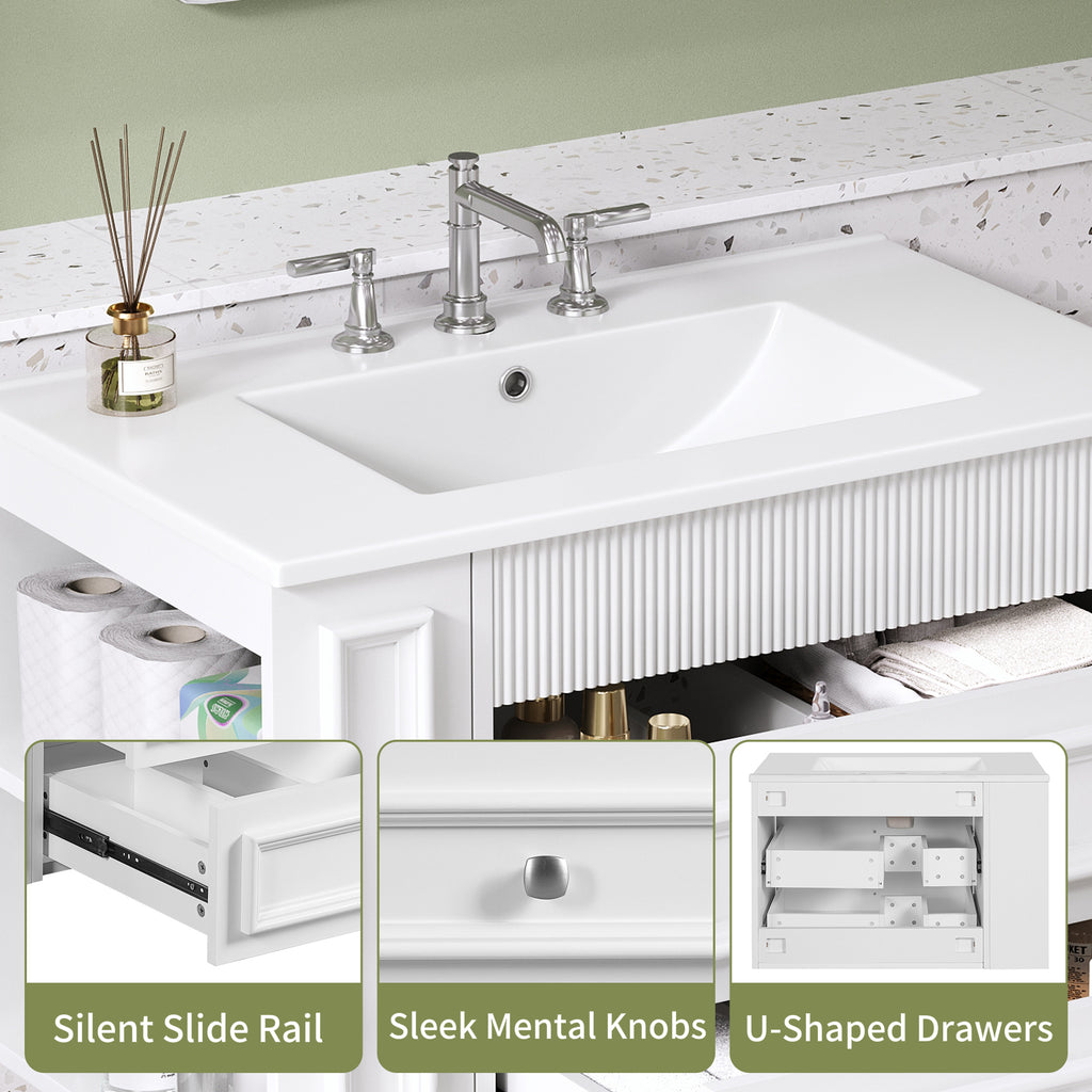 • Versatile Storage : The bathroom vanity cabinet features two large full-extension drawers and open shelving on the sides, providing ample space for cleaning supplies, towels, toiletries, and other bathroom essentials to maintain a tidy, organized space.