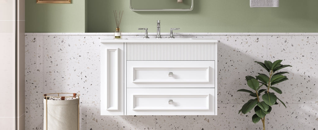 This 30-inch Wall Mounted bathroom cabinet is made of high-quality MDF panels, combining durability and beauty. The unique design not only provides spacious drawer for you to organize various bathroom supplies, but also comes with a practical storage cabinet to meet your needs for space utilization. Each drawer opens smoothly and is equipped with exquisite handles, which is convenient to use and enhances the overall user experience. The meticulous craftsmanship and natural texture of the cabinet make it a visual focal point in the bathroom, creating a warm and comfortable atmosphere. Whether it is modern minimalist style or retro style, this bathroom cabinet can be perfectly integrated and become part of your ideal home. Let it add storage space to your bathroom while also enhancing the overall decorative effect.