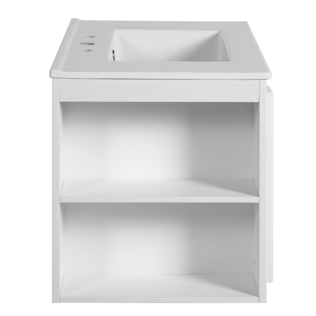 • Integrated Sink for Convenience: The vanity comes with a built-in sink, ensuring a cohesive and streamlined design. The seamless integration of the sink and countertop provides a clean and polished appearance, while also maximizing counter space for your daily essentials. This sink has a smooth surface with a baked-on glaze for added durability and a high-gloss finish. Simply wipe the sink surface with a damp cloth to keep it looking beautiful 8' widespread faucet will fit it.