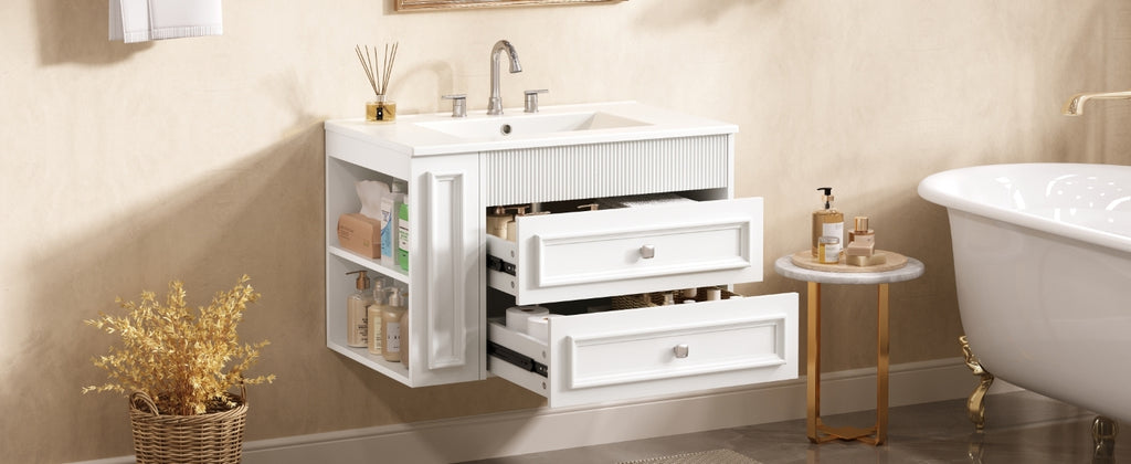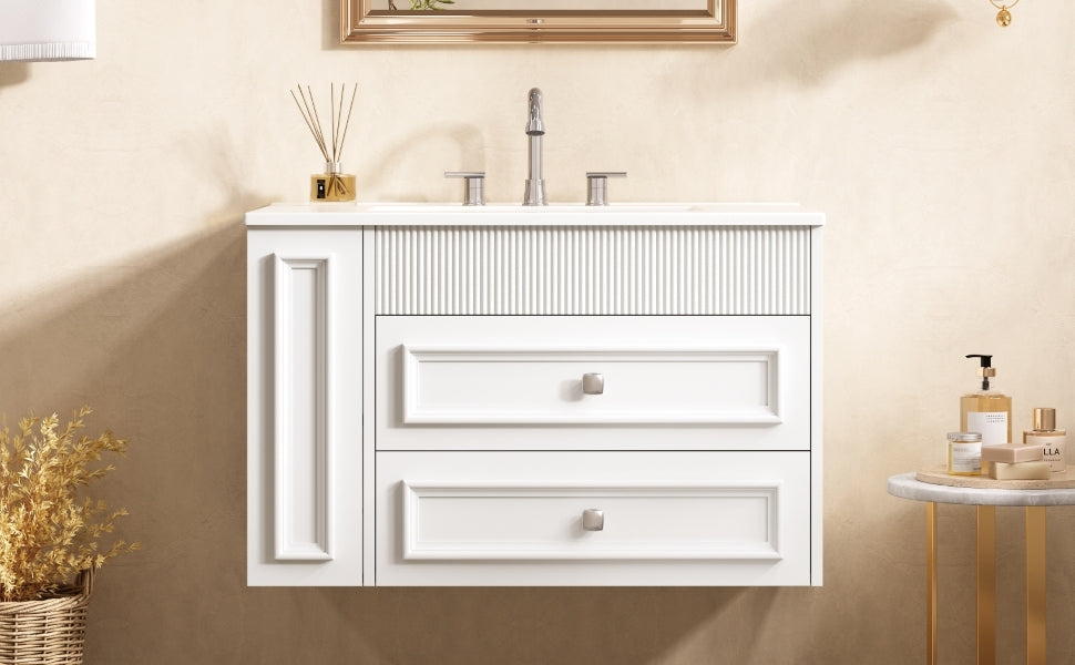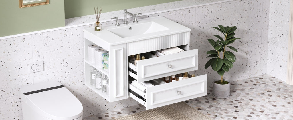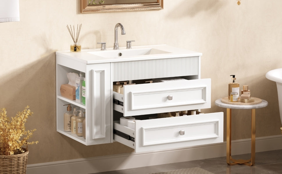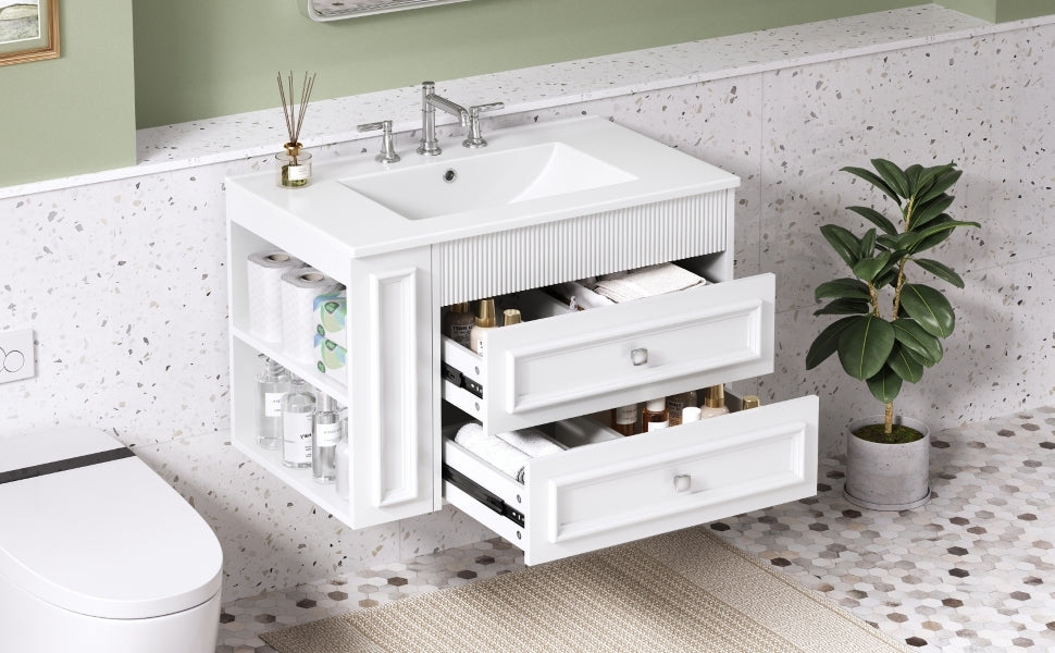 30'' Wall Mounted Bathroom Vanity, Floating Bathroom Storage Cabinet with 2 Drawers, 3 Holes Single Ceramic Sink, Modern Cabinet.