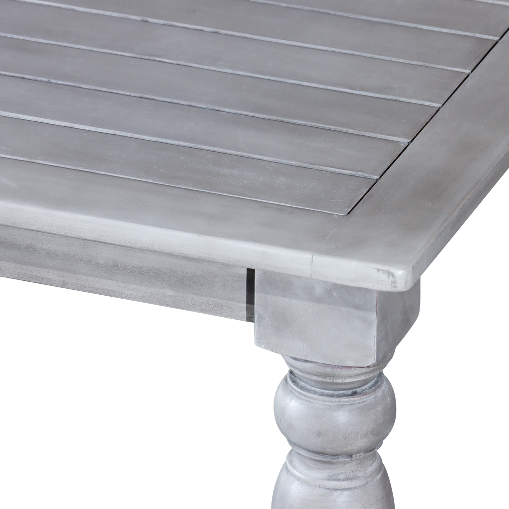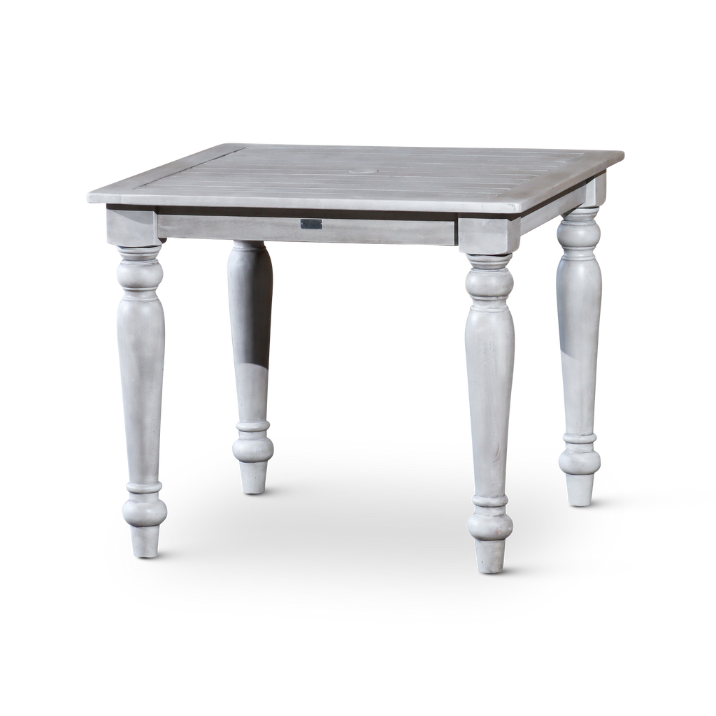 - STYLISH DESIGN: Casual yet stylish this dining table is sure to make your summer gatherings a success. The square table features beautifully turned legs, an umbrella hole and plug and a glazed Silver Gray finish.
