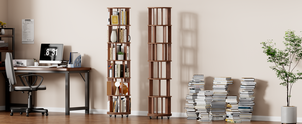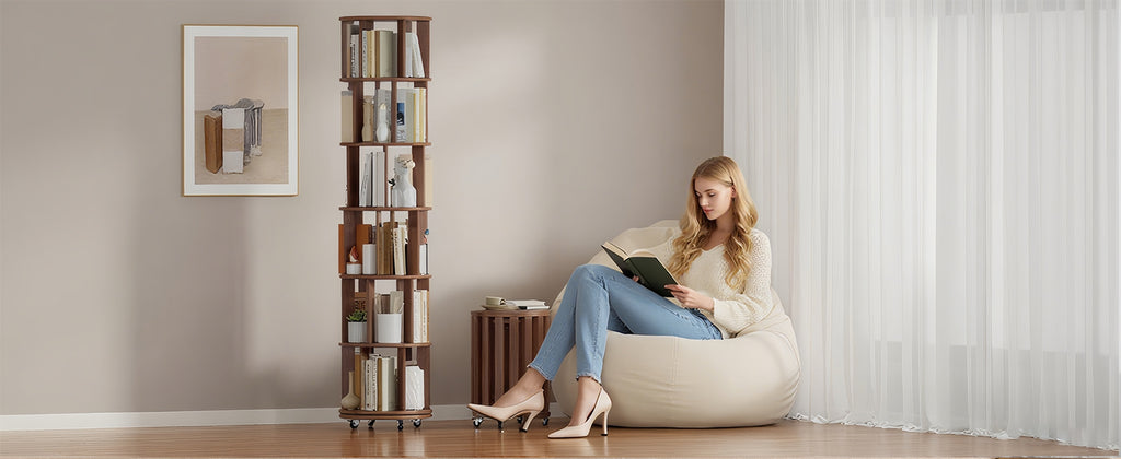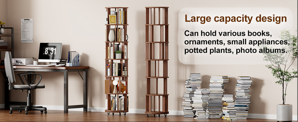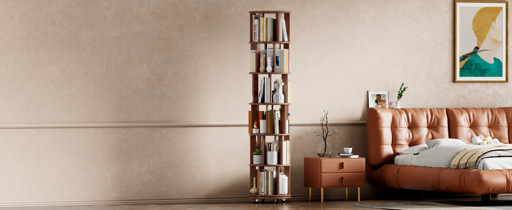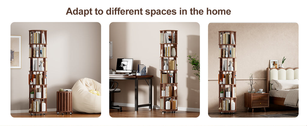 • 360° Safe Rotating Bookshelf: Our swivel bookshelf makes grabbing your favorite reads a breeze. With a gentle spin, your beloved books are right at your fingertips. What's more, keeping your family safe,it comes with lockable caster wheels, ensuring it stands firm even if your playful kids or energetic pets bump into it. With no worries, the easy-roll wheels allow you to effortlessly move the bookshelf to any room, like the bedroom, living room, playroom, or study room