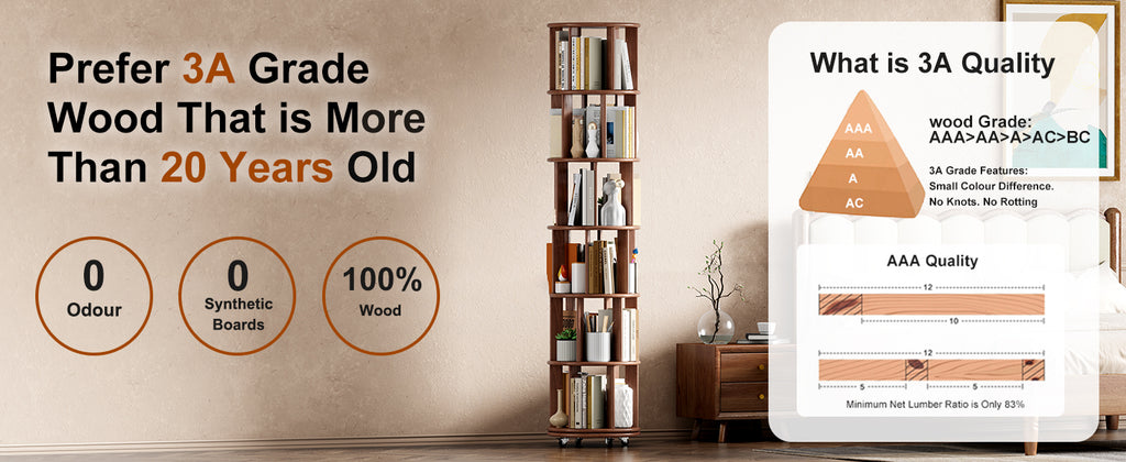 • 100% Natural Rubberwood - Built to Last: Our rotating bookshelf, crafted from eco-friendly and sturdy 100% natural rubber wood, has every inch of the wood carefully selected and polished, revealing the unique warm texture and delicate grain of natural rubber wood, offering you a dual sensory experience of sight and touch. Its modern white, walnut, and natural wood colors are not only aesthetically pleasing but also highly sturdy, adding a touch of elegance and beauty to your home