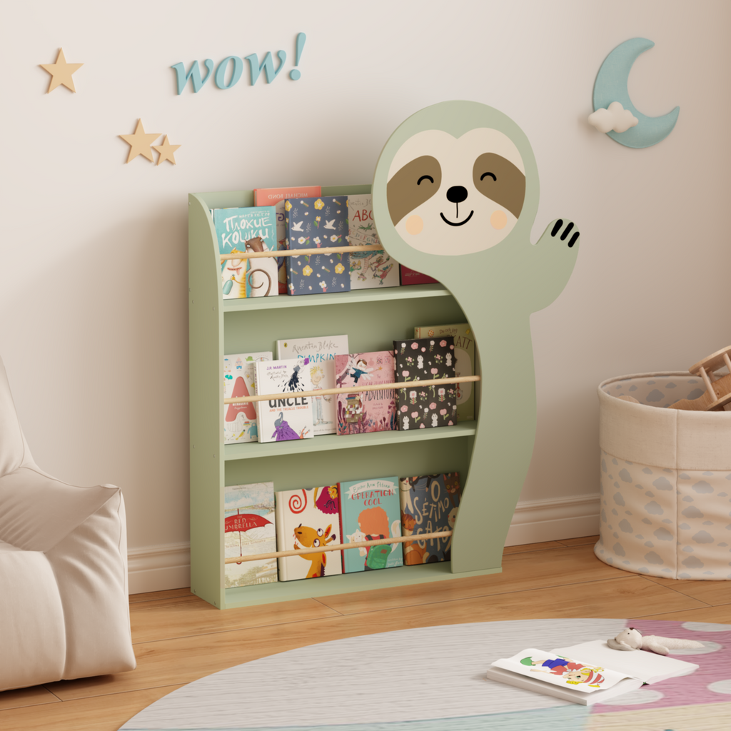 Sloth Kids Bookshelf, Front-Facing Toddler Book Display Rack with 3 Tiers, Cute Animal Design, Wooden Nursery Bookshelf for Playroom, Bedroom & Reading Corner, Safe & Sturdy Storage Organizer