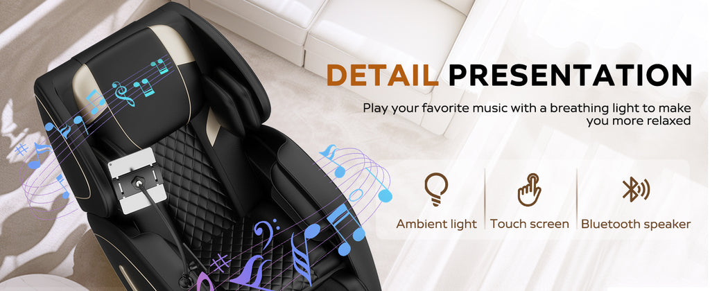 - [Humanized Design] The zero gravity massage chair features built-in rollers at the base, allowing for easy mobility around the room. With a Bluetooth audio connection, you can enjoy your favorite music while relaxing during the massage. The chair is also equipped with soothing blue ambient lights on both sides, creating a calming and comfortable atmosphere.Massage chair with a maximum weight capacity of 180 lbs and a height of no more than 6.1 ft.