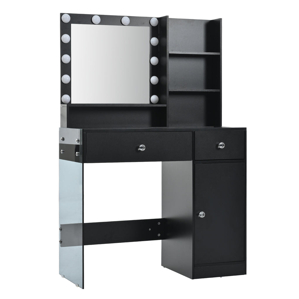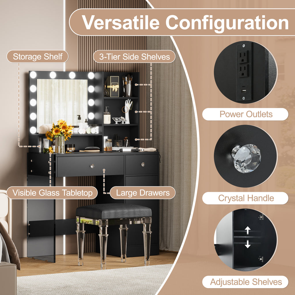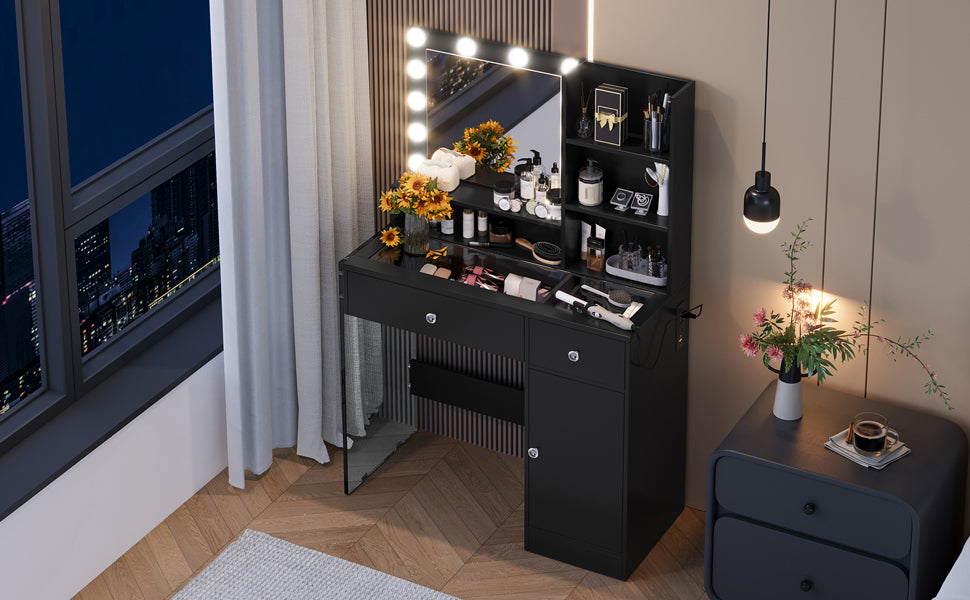Vanity Desk with Mirror and 3 Lighting Modes, Makeup Vanity with Glass Top and Storage Shelves, Dressing Table with 2 Drawers and Cabinet, Black