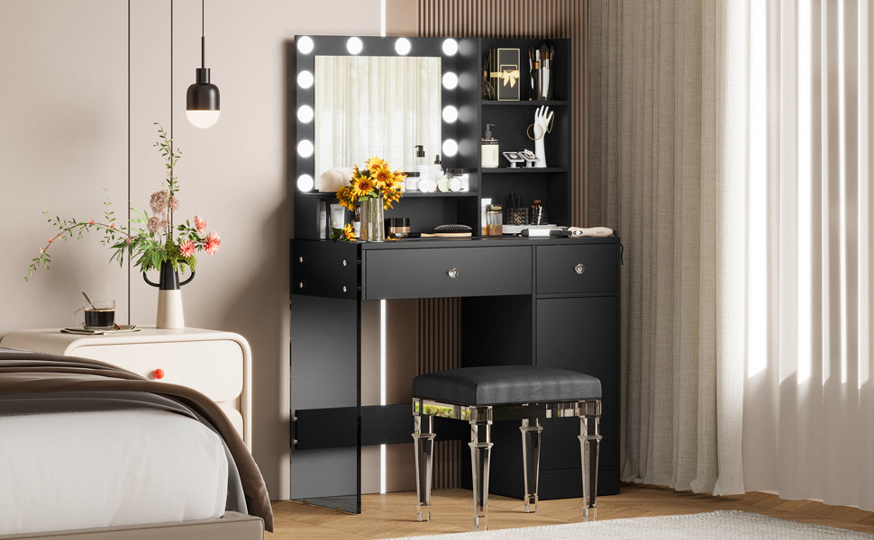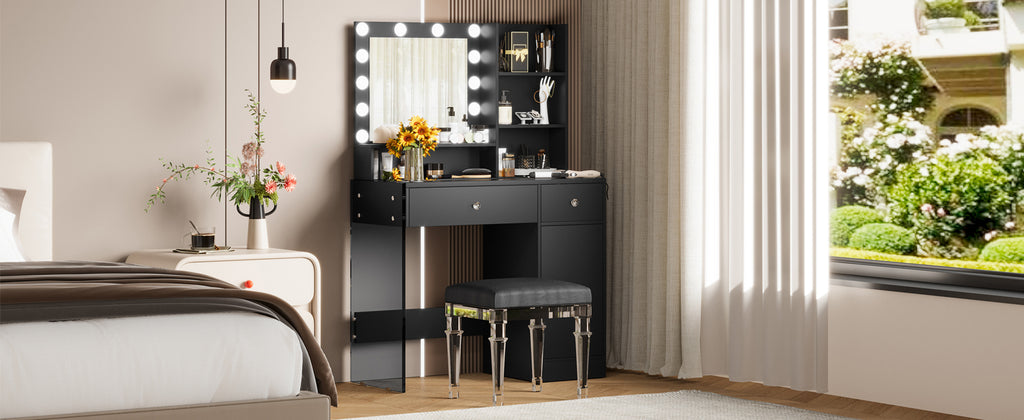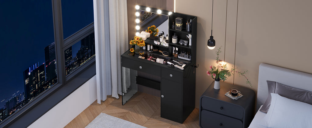 • Ample Storage Space: Equipped with 2 drawers, 1 cabinet with adjustable partitions, and open storage shelves, this vanity offers plenty of space for skincare products, jewelry, cosmetics, and makeup tools. Keep everything organized and easy to access.