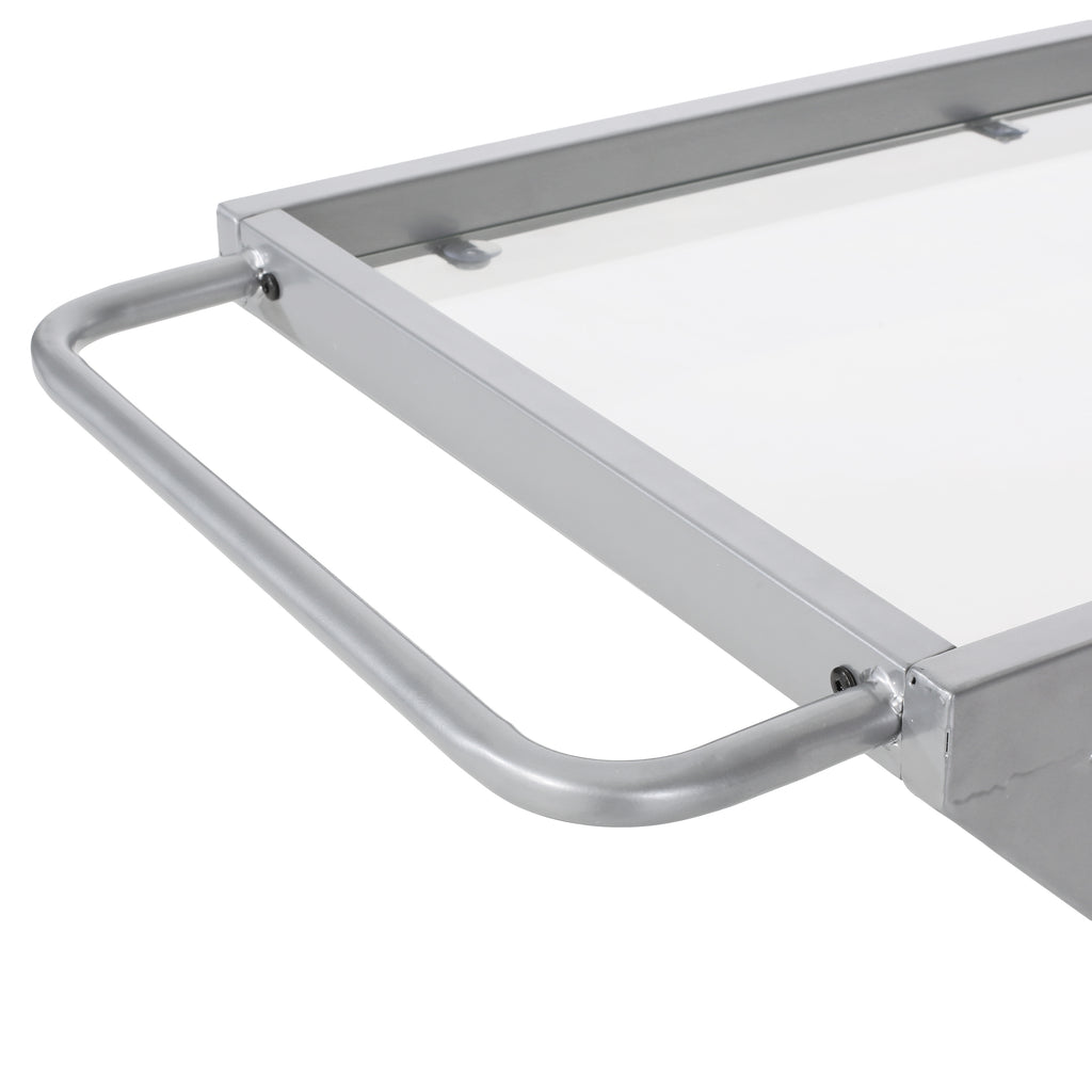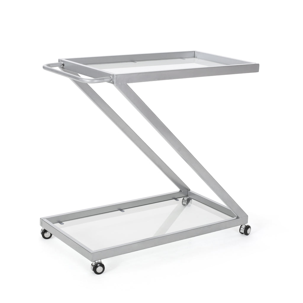Modern Z-Shaped Bar Cart with Tempered Glass Shelves in Silver Glass+Metal