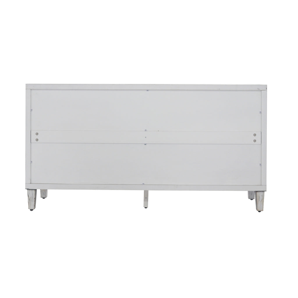 - The sideboard buffet cabinet combines practicality and ornamentation, featuring a shabby chic white wash finish. The cabinet doors are adorned with overlapping circles and square black metal handles, adding a touch of fashion and decoration to the interior space.