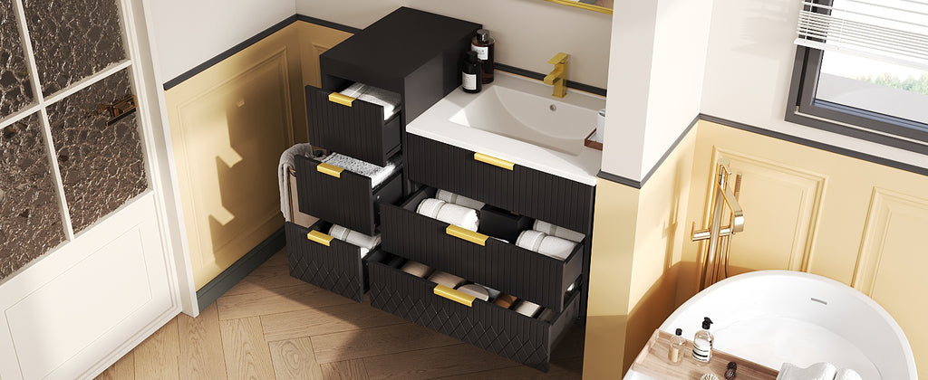 - [A Foundation of Quality and Style] This bathroom cabinet is built upon a foundation of premium materials and thoughtful design. At its heart is a high-quality ceramic basin sink, chosen for its durable, non-porous surface that is exceptionally easy to clean and maintain. The sink is thoughtfully equipped with an anti-spill hole to effectively manage overflow, adding a layer of practical convenience to your daily routine.