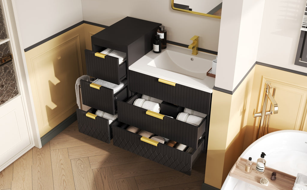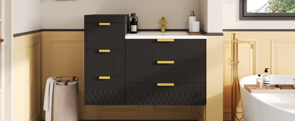 - [Elegance in the Details] Beyond mere functionality, this cabinet showcases a commitment to refined aesthetics. The sleek L-Shape handles are crafted from solid metal, offering a satisfying tactile feel and lasting durability. A subtle stripe carving is elegantly etched across the surfaces, introducing a whisper of texture that catches the light beautifully. This minimalist detail elevates the entire piece, transforming it from a simple storage unit into a deliberate element of your bathroom.
