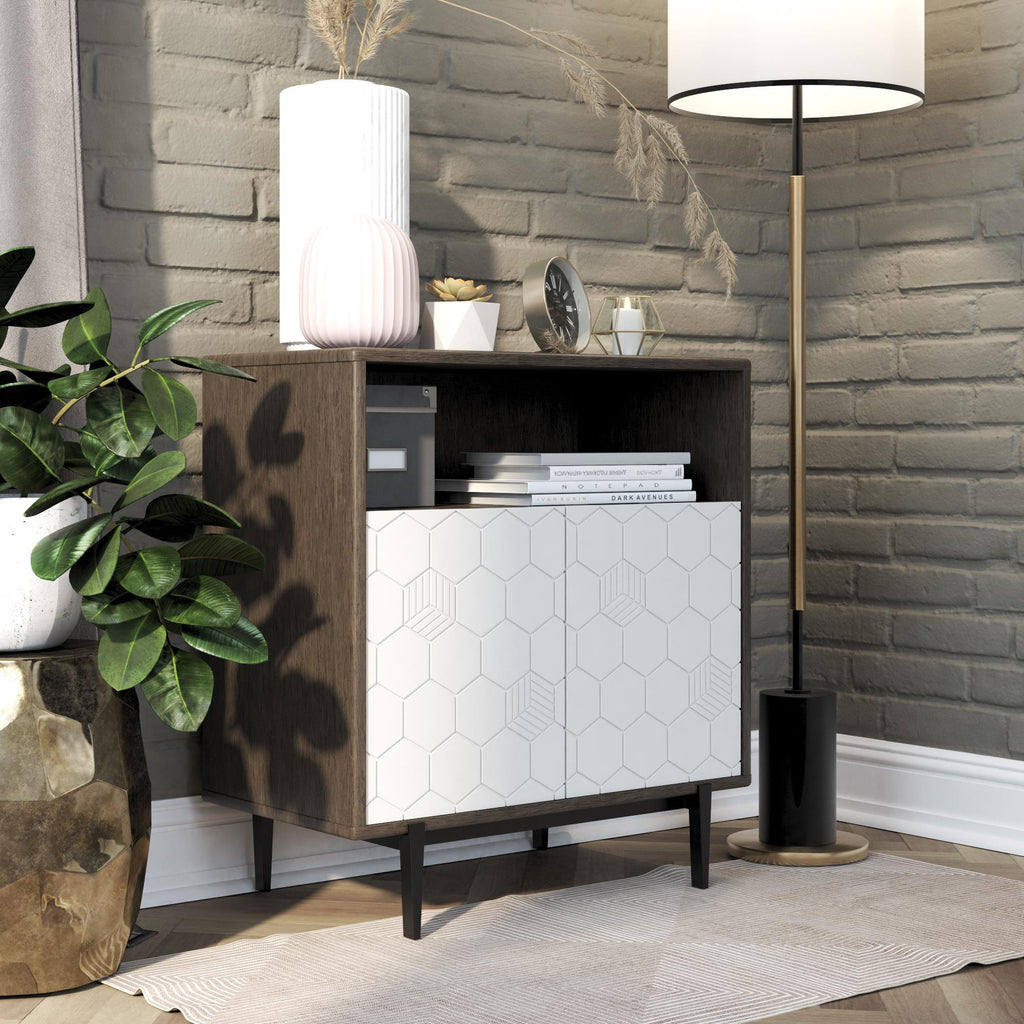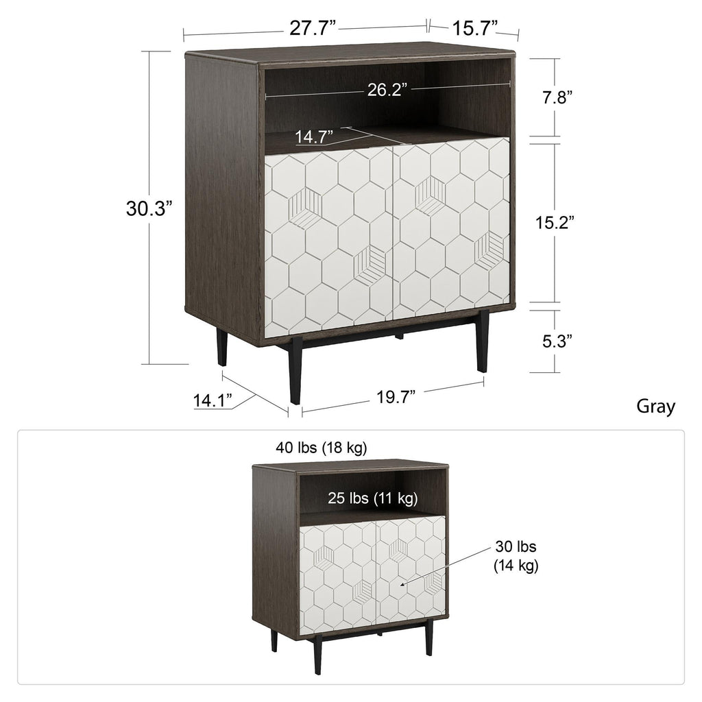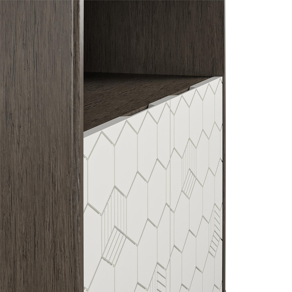 The Olivia Storage Cabinet is a storage dream come true. With its modern silhouette in a trendy gray woodgrain finish with brown undertones, the Olivia will liven up any space. This glam cabinet features two geometric patterned door fronts and an open cubby shelf for obsessorizing. Built with real wood veneer and painted MDF, the Olivia is a top-notch, space-saving addition to your adult home.