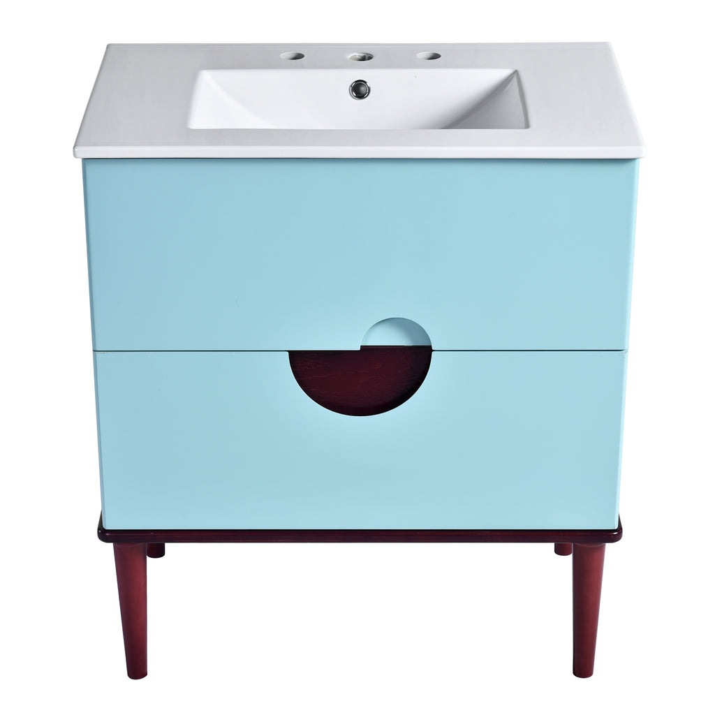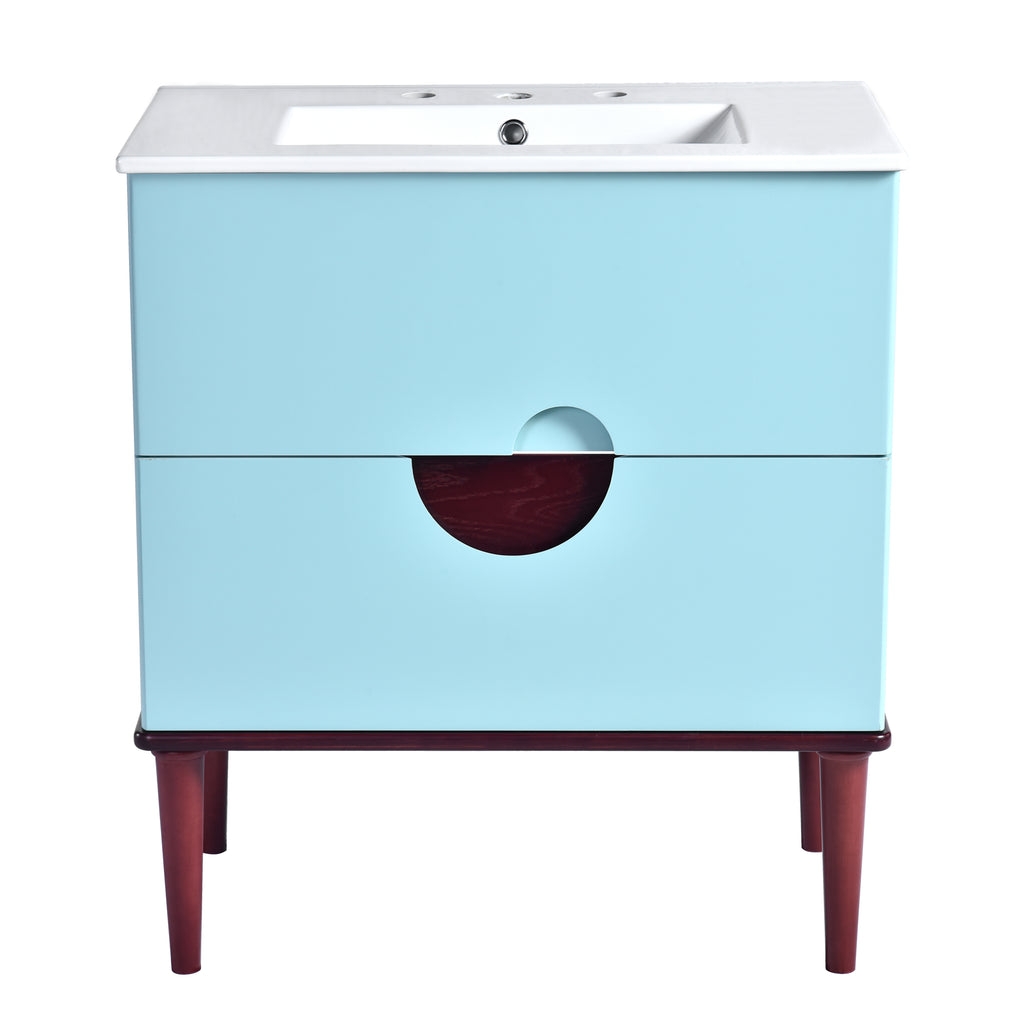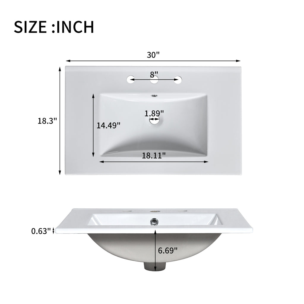 - [Solid Wood Structure & Glossy Ceramic Basin]As a functional furniture in bathroom, the following materials are used for this bathroom vanity: ceramic for basin, solid rubber wood for frame and MDF boards for drawers. Ceramic material has the advantage of being smooth and easy to clean. MDF boards are wearable and durable as well.
