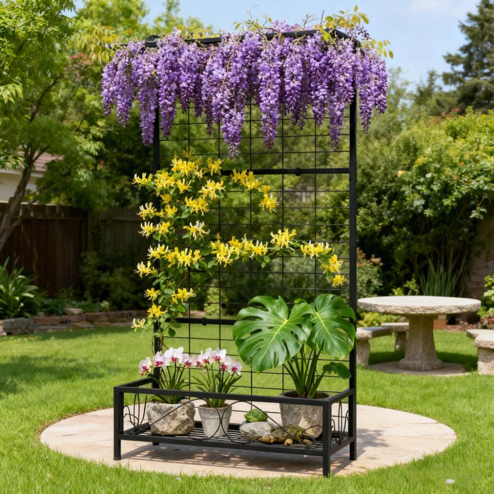 - - Weather-Resistant Construction: Made of powder-coated steel, this plant pot stand resists the elements. Rain or shine, your flowers and vines will thrive, while the rust-resistant frame ensures lasting beauty year after year